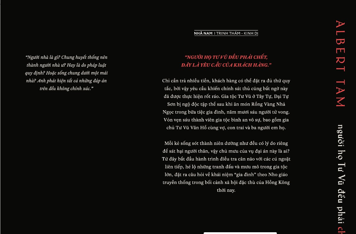 Nhà phát hành: Nhã Nam Nhà xuất bản: Hội Nhà Văn Tác giả: Albert Tam Dịch giả: Hồng Hạnh Số trang: 457 Kích thước: 14 x 20.5 cm   "NGƯỜI HỌ TƯ VŨ ĐỀU PHẢI CHẾT, ĐÂY LÀ YÊU CẦU CỦA KHÁCH HÀNG.”   Chỉ cần trả nhiều tiền, khách hàng có thể đặt ra đủ thứ quy tắc, bởi vậy yêu cầu khiến chính sát thủ cũng bất ngờ này đã được thực hiện rốt ráo. Gia tộc Tư Vũ ở Tây Tự, Đại Tự Sơn bị ngộ độc tập thể sau khi ăn món Rồng Vàng Nhà Ngọc trong bữa tiệc gia đình, năm mươi sáu người tử vong. Vỏn vẹn sáu thành viên gia tộc bình an vô sự, bao gồm gia chủ Tư Vũ Văn Hồ cùng vợ, con trai và ba người em họ.   Mỗi kẻ sống sót thành niên dường như đều có lý do riêng để sát hại người thân, vậy chủ mưu của vụ đại án này là ai? Từ đây bắt đầu hành trình điều tra cân não với các cú ngoặt liên tiếp, hé lộ những tranh đấu và mưu mô trong gia tộc lớn, đặt ra câu hỏi về khái niệm “gia đình” theo Nho giáo truyền thống trong bối cảnh xã hội đặc thù của Hồng Kông thời nay.