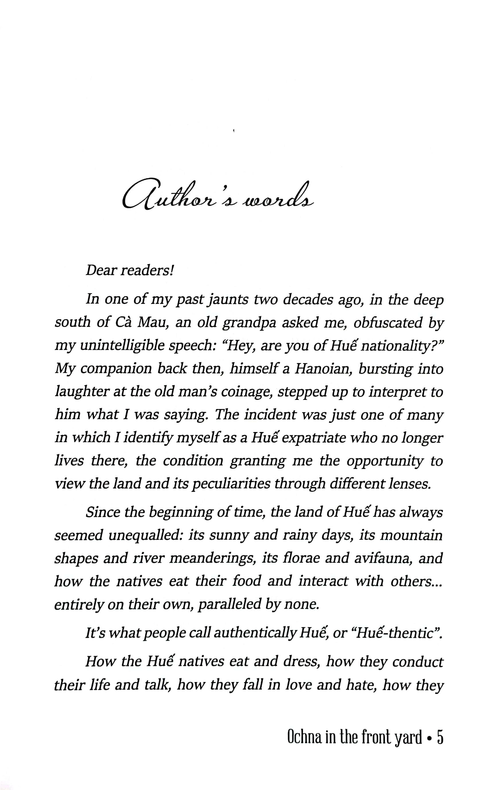 Chia sẻ về đứa con tinh thần của m.ình, tác giả Minh Tự nói: “Những tháng năm tôi được làm một người Huế sống ngoài Huế, và nhờ vậy mới hiểu rõ hơn, một cách khách quan hơn, về bản sắc riêng biệt của xứ sở này... Cuốn sách này xin cùng khám phá nghệ thuật sống của người Huế, dù không thể nói hết muôn màu muôn vẻ của ‘lối Huế’. Nó chỉ là những trạng thái của Huế được chúng tôi ‘đọc’ được và thuật lại bằng cách của một người viết báo.”
