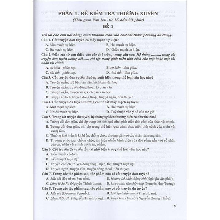 Phần các đề kiểm tra định kỳ có 40 đề, được chia thành đề kiểm tra 1 tiết (thời gian làm bài 45 phút) và đề kiểm tra 2 tiết (thời gian làm bài 90 phút). Mỗi đề luyện tập có thể là một đoạn văn, đoạn thơ hoặc một văn bản được lấy làm ngữ liệu để xây dựng các dạng câu hỏi. Nội dung các câu hỏi đi từ các mức độ nhận thức của học sinh như: Nhận biết, Thông hiểu, Vận dụng, Vận dụng cao. Phần viết có nhiều kiểu bài, sẽ giúp các em có thêm những khám phá thú vị khi luyện viết các đoạn văn và bài làm văn khác nhau nhằm nâng cao năng lực ngôn ngữ và năng lực Ngữ văn của mình. Đặc biệt, phần cung cấp các đoạn văn, bài văn tham khảo sẽ giúp các em rút ra được những bài học, những kinh nghiệm trong việc nâng cao kỹ năng viết văn của mình. Với 72 đề ôn luyện Ngữ văn, cuốn Ôn tập - Kiểm tra nâng cao và phát triển năng lực Ngữ văn 8, tập một, được biên soạn bám sát các chủ đề có trong Chương trình Ngữ văn mới, có mở rộng và có nâng cao thêm các ngữ liệu ngoài chương trình, phù hợp với yêu cầu đổi mới kiểm tra, đánh giá môn Ngữ văn theo định hướng phát triển năng lực học sinh.
