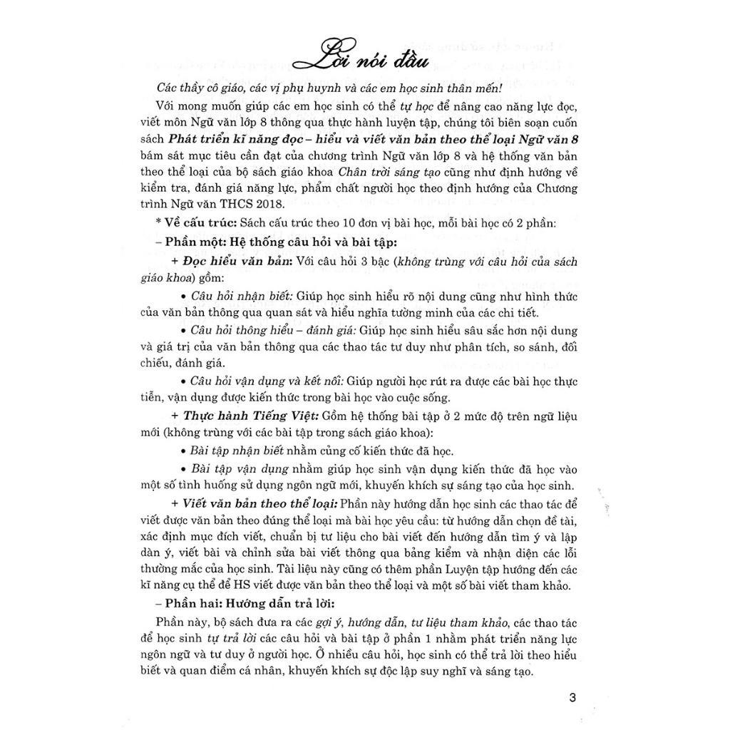 Với mong muốn giúp các em học sinh có thể tự học để nâng cao năng lực đọc – hiểu, viết môn Ngữ văn lớp 8 thông qua thực hành luyện tập, cuốn sách Phát triển kĩ năng đọc – hiểu và viết văn bản theo thể loại Ngữ văn 8 được biên soạn bám sát mục tiêu cần đạt của chương trình Ngữ văn lớp 8 và hệ thống văn bản theo thể loại của sách giáo khoa Chân trời sáng tạo cũng như định hướng về kiểm tra, đánh giá năng lực, phẩm chất người học theo định hướng của Chương trình Ngữ văn THCS 2018.