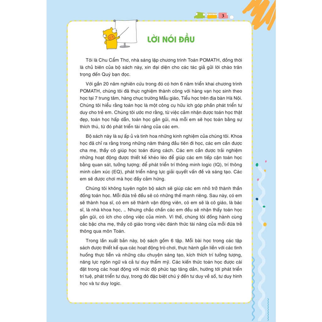 Với mong muốn các bậc phụ huynh có được tài liệu và phương pháp dạy toán cho con đúng cách, chúng tôi xin giới thiệu tới các bạn bộ sách: POMATH – Toán tư duy cho trẻ em. Các em sẽ được tiếp cận toán học bằng quan sát, tưởng tượng để phát triển trí thông minh logic (IQ), trí thông minh cảm xúc (EQ) và phát triển năng lực giải quyết vấn đề và sáng tạo thông qua bộ POMATH này. Bộ sách gồm 6 tập, kiến thức được sắp xếp tăng dần qua từng tập và dành riêng cho trẻ em từ 4 – 6 tuổi. Tập 2 với những kiến thức cơ bản sẽ là bước đầu tiên để các bé tiếp xúc với toán học.