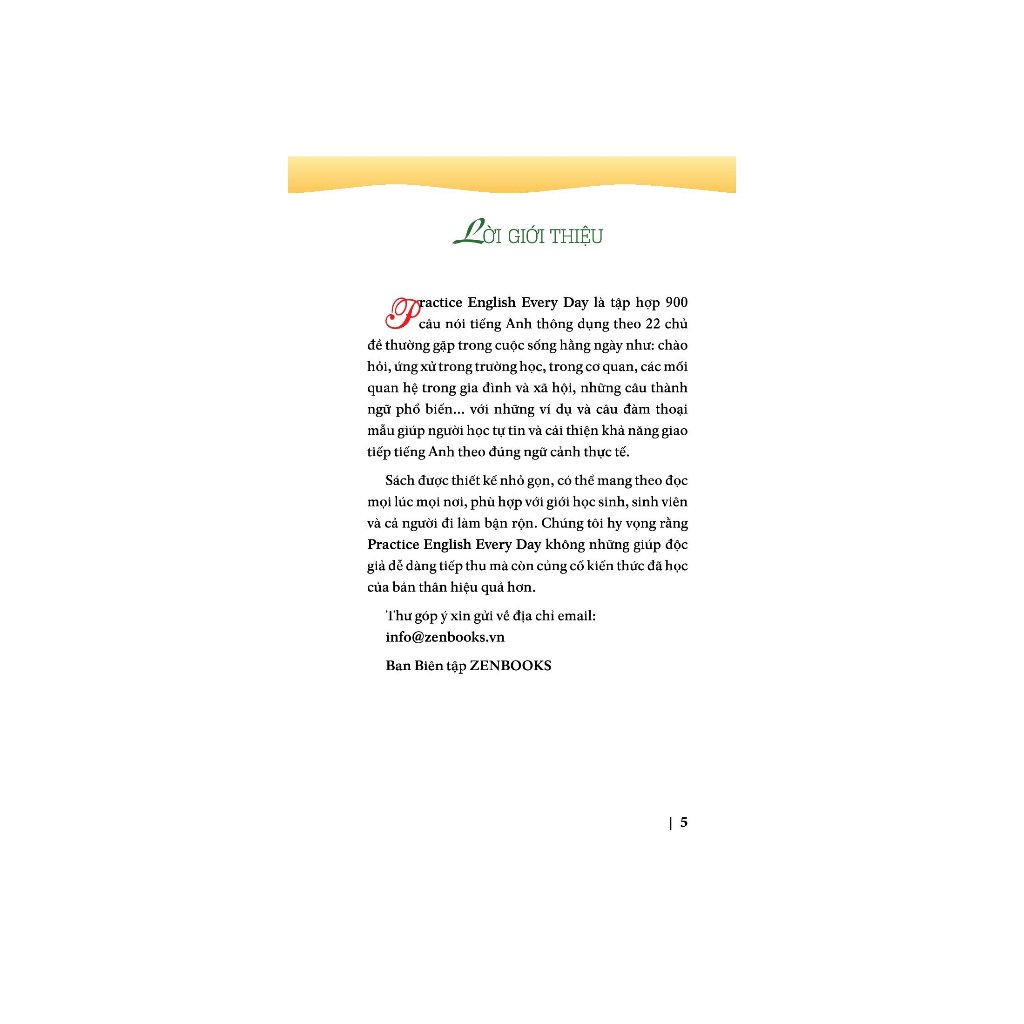 Practice English Every Day - Đối Đáp Tiếng Anh Không Cần Nghĩ Practice English Every Day - Đối đáp Tiếng Anh không cần nghĩ gồm 900 câu tiếng Anh thông dụng với những mẫu đàm thoại đơn giản giúp người học tự tin và cải thiện khả năng giao tiếp tiếng Anh trong những tình huống thực tế của cuộc sống như: chào hỏi, giao tiếp và ứng xử trong trường học, trong cơ quan, các mối quan hệ trong gia đình, xã hội. Ngoài ra, bạn còn được học thêm những câu thành ngữ thông dụng nhất bằng tiếng Anh nữa. Sách được thiết kế nhỏ gọn để có thể mang theo đọc mọi lúc mọi nơi, hoàn toàn phù hợp với giới học sinh, sinh viên và cả người làm văn phòng bận rộn. Hy vọng rằng Practice English Every Day không những giúp độc giả dễ dàng tiếp thu mà còn củng cố kiến thức đã học một cách hiệu quả hơn.