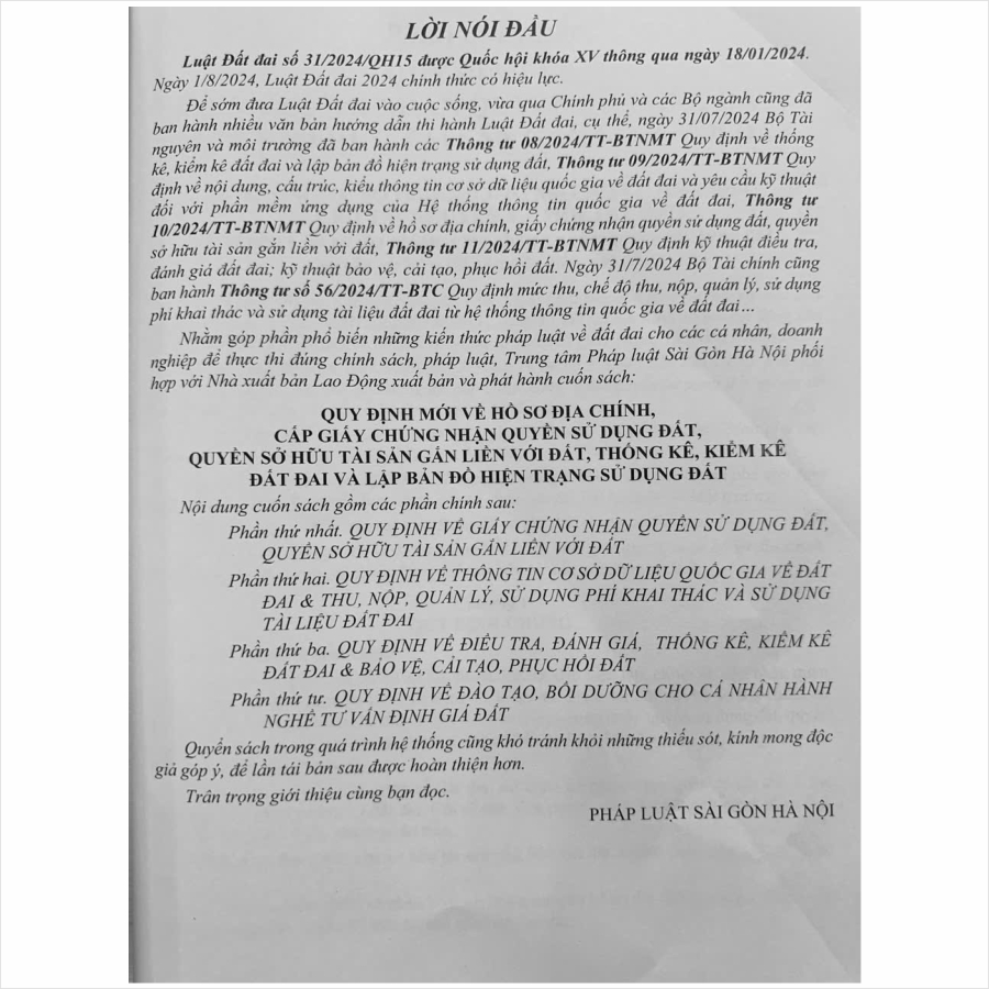Để giúp bạn đọc thuận tiện tra cứu, tham khảo Luật Đất đai, Luật sửa đổi, bổ sung một số điều của Luật Đất đai số 31/2024/QH15, và các nghị định hướng dẫn thi hành mới nhất, Nhà sách Nam Việt xin trân trọng giới thiệu cuốn sách: Quy Định Mới Về Hồ Sơ Địa Chính, Cấp Giấy Chứng Nhận Quyền Sử Dụng Đất, Quyền Sở Hữu Tài Sản Gắn Liền Với Đất, Thống Kê, Kiểm Kê Đất Đai Và Lập Bản Đồ Hiện Trạng Sử Dụng Đất