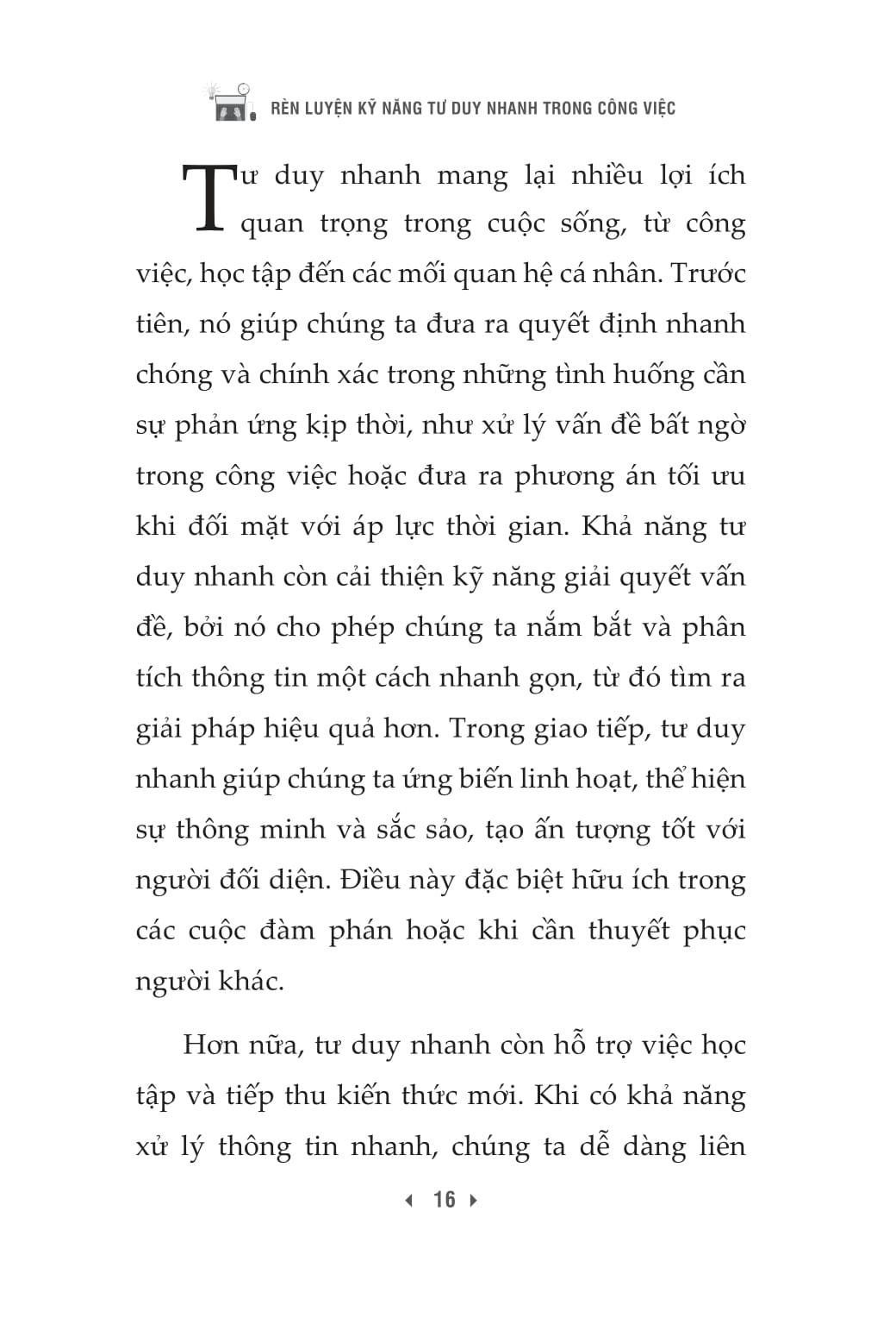 Trong bối cảnh hiện đại, tốc độ và áp lực trở thành đặc trưng của môi trường làm việc. Việc ra quyết định trong thời gian ngắn không chỉ là yêu cầu kỹ thuật mà còn là lợi thế cạnh tranh. Cuốn sách "Rèn luyện kỹ năng tư duy nhanh trong công việc" được biên soạn nhằm đáp ứng đúng nhu cầu đó, trang bị cho người đọc một hệ thống công cụ để suy nghĩ nhanh mà không đánh đổi sự chính xác.