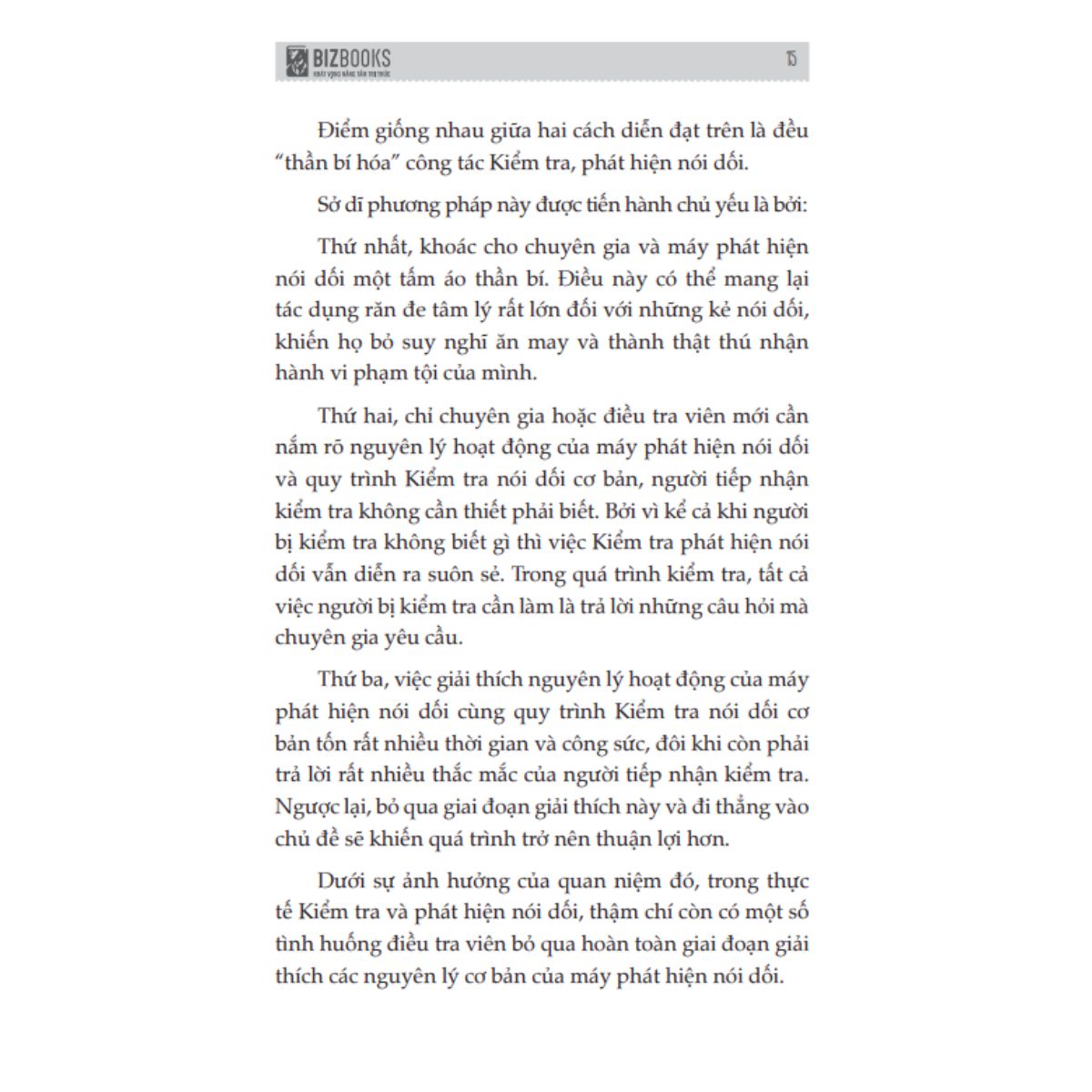 Tác giả chia sẻ những nguyên tắc cơ bản và quy trình kiểm tra nói dối, từ việc sử dụng máy phát hiện nói dối đến các kỹ thuật tâm lý để đánh giá độ tin cậy của lời nói. Cuốn sách không chỉ giải thích chi tiết về các chỉ số sinh lý được ghi lại trong quá trình kiểm tra, mà còn đưa ra những phân tích về tâm lý và hành vi của người nói dối.