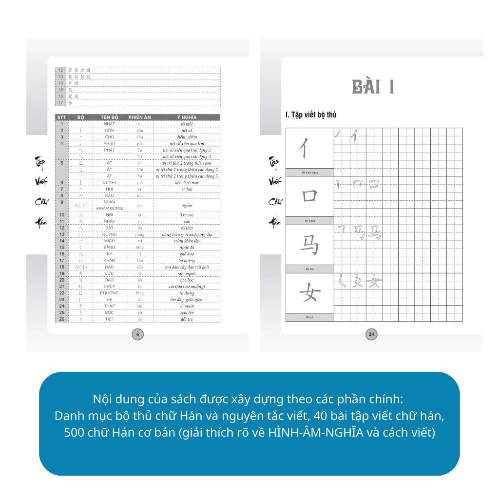 - 500 từ vựng học đến bao giờ mới nhớ được? Tất cả mọi nỗi lo sẽ được xóa tan khi có trong tay quyển "Tập Viết Chữ Hán (Biên soạn theo GTHN Phiên Bản Mới)", đây là cuốn tập viết không thể thiếu khi học tiếng Trung và sẽ đồng hành cùng bạn chinh phục tiếng Trung từ những bước đầu tiên Nội dung của sách "Tập viết chữ Hán - Dựa theo giáo trình Hán ngữ phiên bản mới" gồm:
