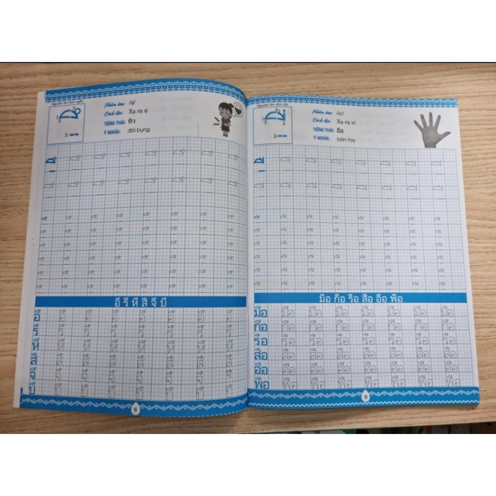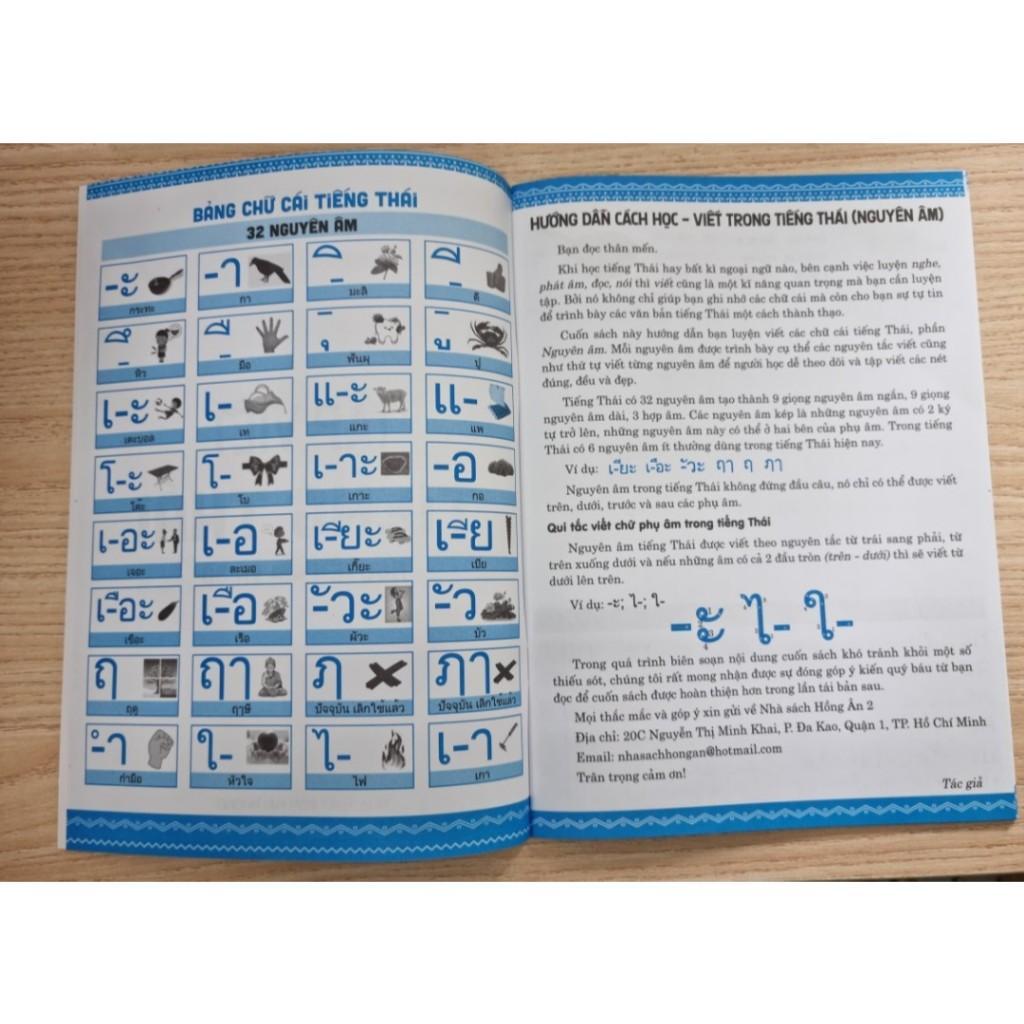 Khi học tiếng Thái hay bất kì ngoại ngữ nào, bên cạnh việc luyện nghe, phát âm, đọc, nói thì viết cũng là một kĩ năng quan trọng mà bạn cần luyện tập. Bởi nó không chỉ giúp bạn ghi nhớ các chữ cái mà còn cho bạn sự tự tin để trình bày các văn bản tiếng Thái một cách thành thạo. Cuốn sách này hướng dẫn bạn luyện viết các chữ cái tiếng Thái, phần Nguyên âm. Mỗi nguyên âm được trình bày cụ thể các nguyên tắc viết cũng như thứ tự viết từng nguyên âm để người học dễ theo dõi và tập viết các nét đúng, đều và đẹp. Tiếng Thái có 32 nguyên âm tạo thành 9 giọng nguyên âm ngắn, 9 giọng nguyên âm dài, 3 hợp âm. Các nguyên âm kép là những nguyên âm có 2 ký tự trở lên, những nguyên âm này có thể ở hai bên của phụ âm. Trong tiếng Thái có 6 nguyên âm ít thường dùng trong tiếng Thái hiện nay.