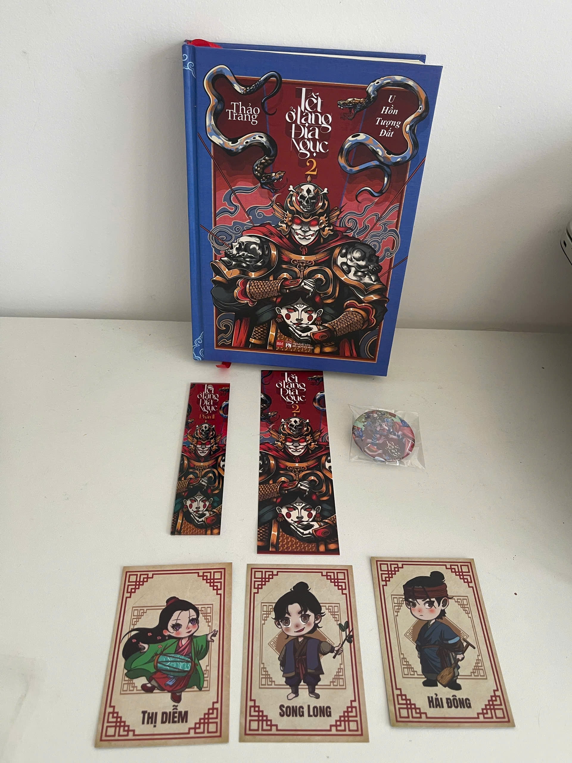 Bản thương mại bìa cứng bao gồm: 1 cuốn sách, kèm chữ ký tác giả, triện tên, bookmark giấy, bookmark mica, 3 thiệp chibi nhỏ và 1 huy hiệu bìa sách