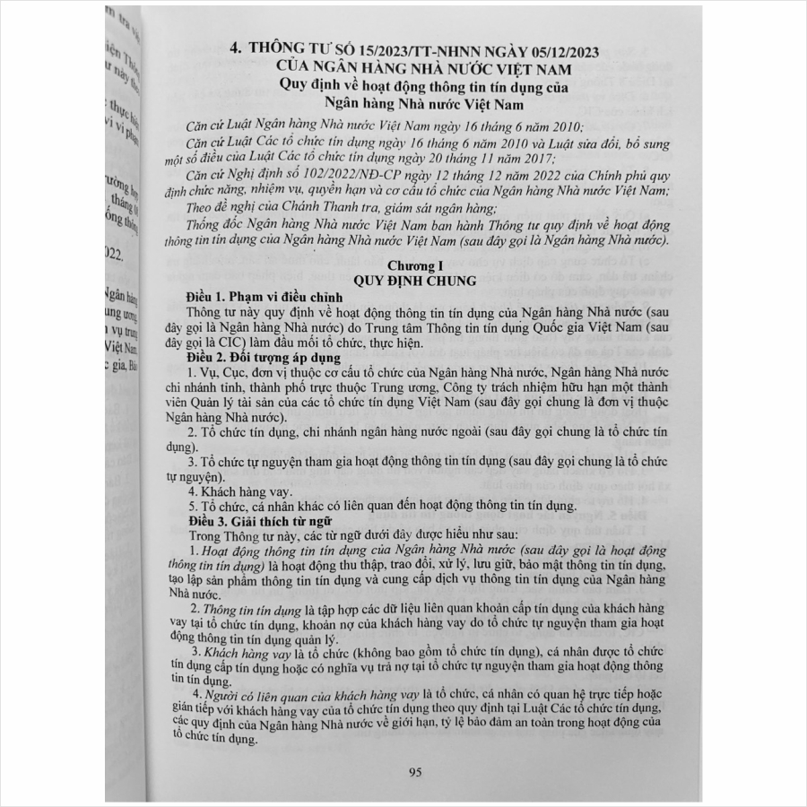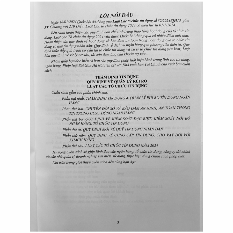 - Toàn bộ sách bìa mềm khổ lớn 20 x 28 cm phân phối bởi Nhà sách Nam Việt đều được bọc sách Plastic MIỄN PHÍ và xuất hóa đơn điện tử đầy đủ, nhanh chóng. …//… Lời giới thiệu: Ngày 18/01/2024 Quốc hội đã thông qua Luật Các tổchức tín dụng số 32/2024/QH15 gồm XV Chương với 210 Điều. Luật Các tổ chức tín dụng 2024 có hiệu lực từ 01/7/2024. Bên cạnh hoàn thiện các quy định hạn chế tình trạng thao túng hoạt động của tổ chức tín dụng, Luật các Tổ chức tín dụng 2024 vừa được Quốc hội thông qua có nhiều điểm mới như: Hoàn thiện các quy định về hoạt động và bảo đảm an toàn trong hoạt động của tổ chức tín dụng và quỹ tín dụng nhân dân; Quy định về dịch vụ ngân hàng qua phương tiện điện tử; Quy định thúc đẩy quá trình cơ cấu tại tổ chức tín dụng và xử lý tổ chức tín dụng yếu kém; Luật hóa quy định về xử lý nợ xấu, tài sản đảm bảo của khoản nợ xấu… Nhằm phổ biến đến Quý Cơ quan, Đơn vị và Quý khách hàng thân thiết nắm bắt kịp thời những quy định mới nêu trên. Nhà sách Nam Việt xin trân trọng giới thiệu cuốn sách: Thẩm Định Tín Dụng – Quy Định Về Quản Lý Rủi Ro và Luật Các Tổ Chức Tín Dụng …//… Cuốn sách gồm các phần chính sau: Phần thứ nhất. Thẩm định tín dụng & quản lý rủi ro tín dụng ngân hàng Phần thứ hai. Chuyển đổi số và bảo đảm an ninh, an toàn thông tin trong hoạt động ngân hàng Phần thứ ba. Quy định về kiểm soát đặc biệt, kiểm soát nội bộ ngân hàng, tổ chức tín dụng Phần thứ tư. Quy định mới về quỹ tín dụng nhân dân Phần thứ năm. Quy định về cung cấp tín dụng, cho vay đối với khách hàng Phần thứ sáu. Luật các tổ chức tín dụng năm 2024 ...//... Cảm ơn các bạn đã ghé thăm shop Nhà sách Nam Việt ! Sách Thẩm Định Tín Dụng – Quy Định Về Quản Lý Rủi Ro và Luật Các Tổ Chức Tín Dụng Sách Thẩm Định Tín Dụng – Quy Định Về Quản Lý Rủi Ro và Luật Các Tổ Chức Tín Dụng
