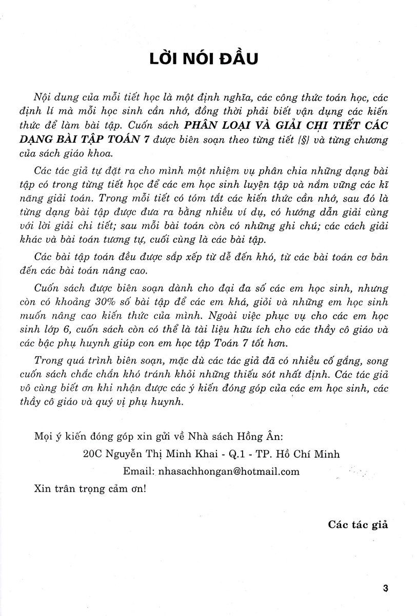 Cuốn sách được biên soạn dành cho đại đa số các em học sinh, nhưng còn có khoảng 30% số bài tập để các em khá, giỏi và những em học sinh muốn nâng cao kiến thức của mình. Ngoài việc phục vụ cho các em học sinh lớp 6, cuốn sách còn có thể là tài liệu hữu ích cho các thầy cô giáo và các bậc phụ huynh giúp con em học tập Toán 7 tốt hơn .