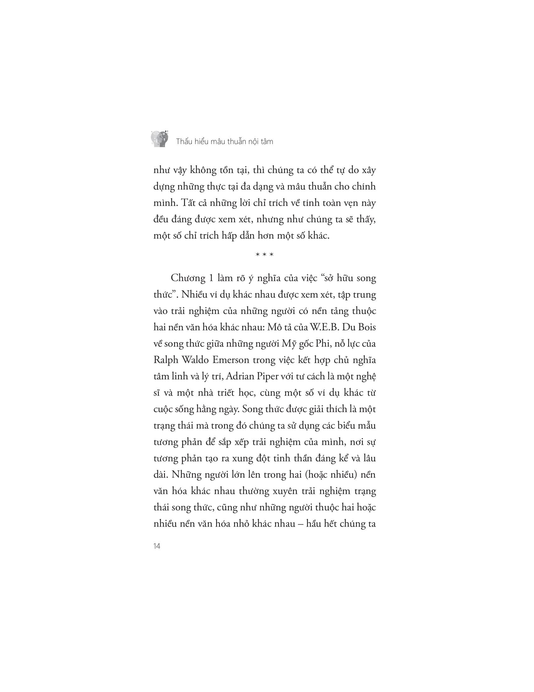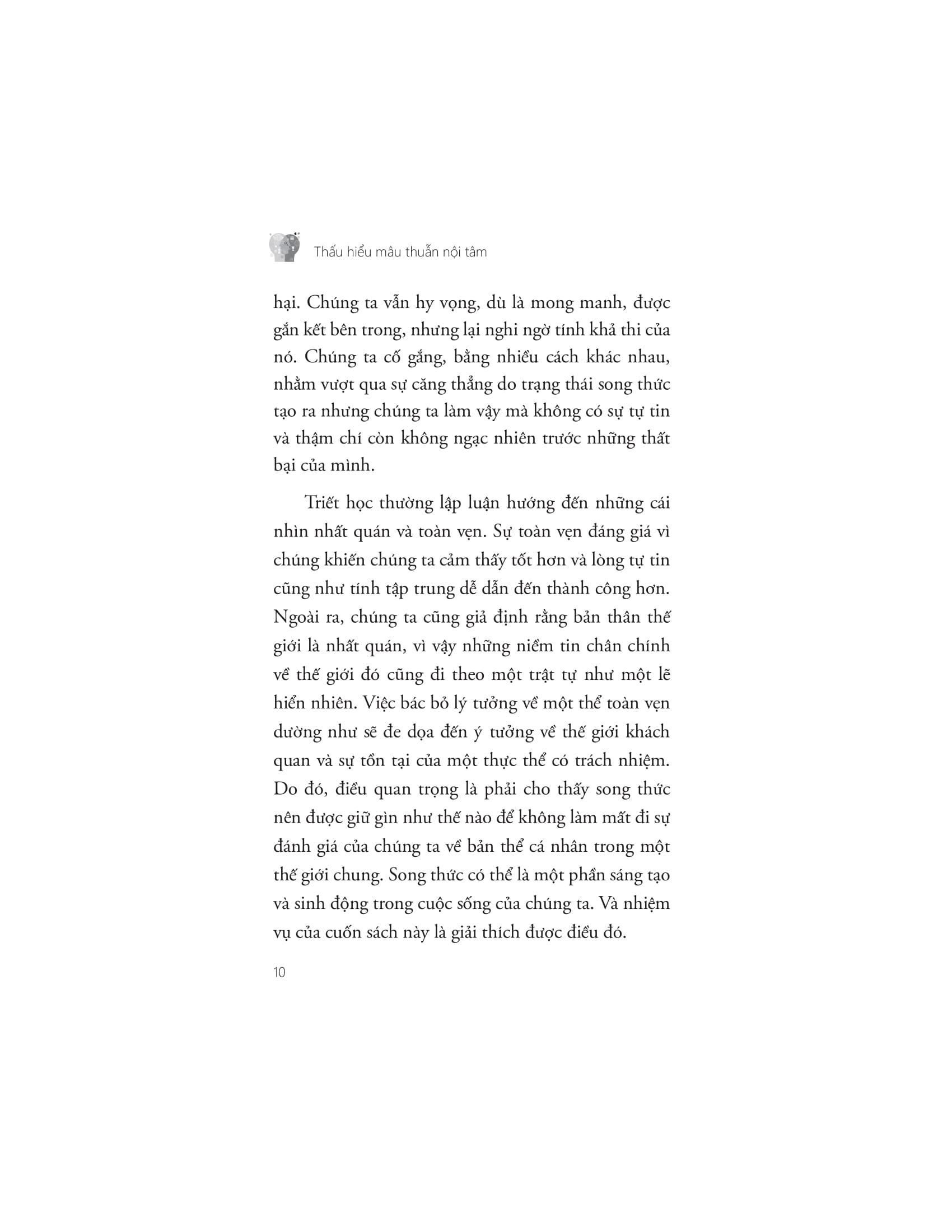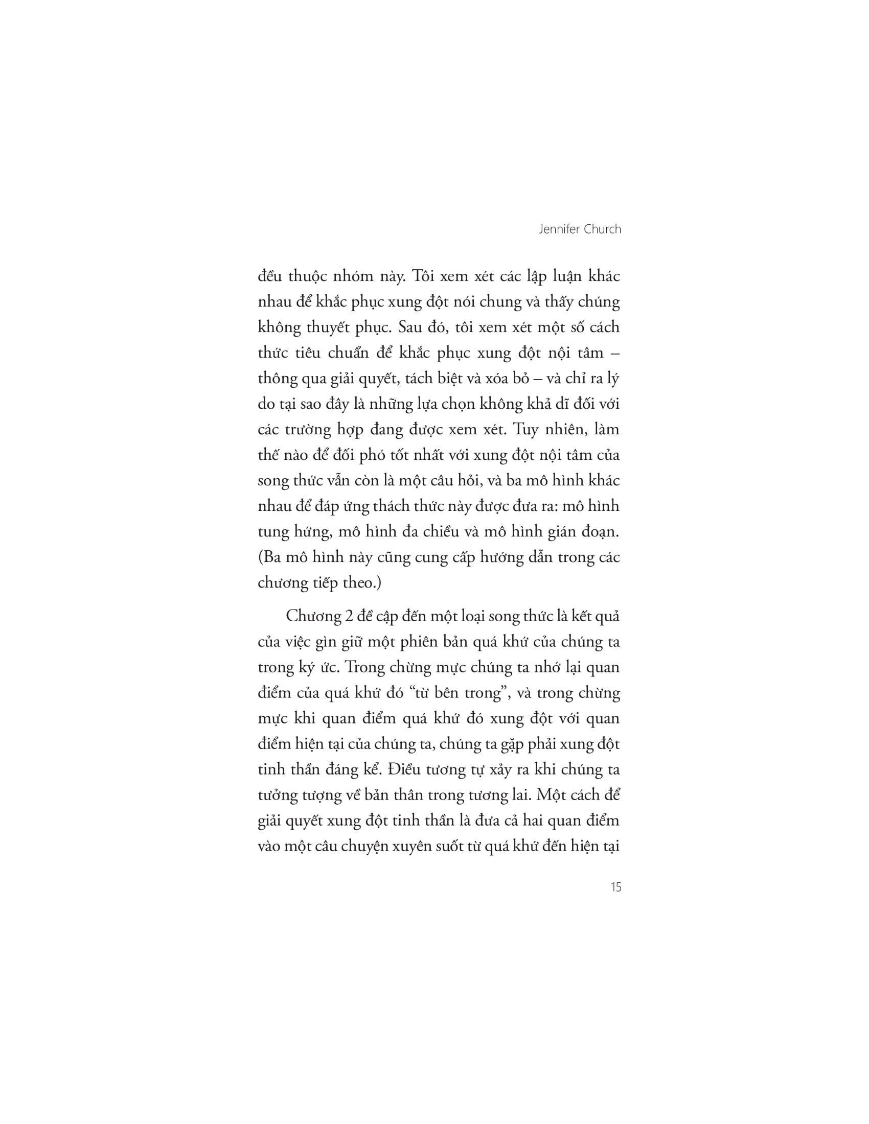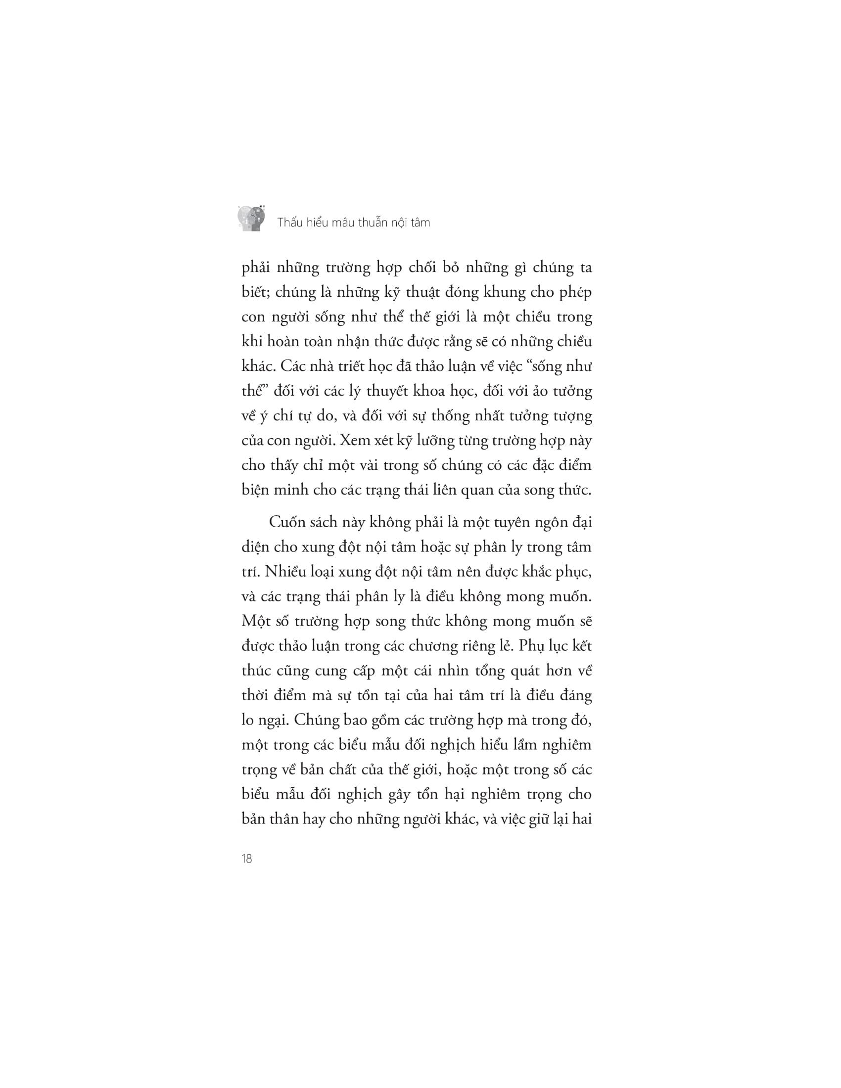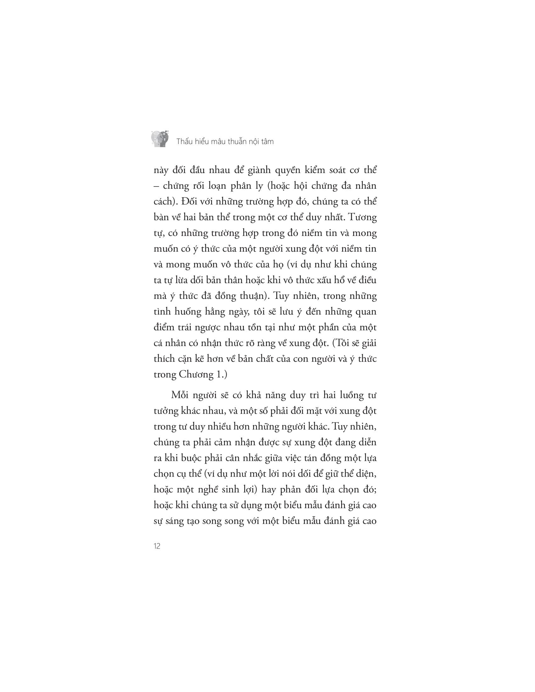 Thấu Hiểu Mâu Thuẫn Nội Tâm Mỗi ngày, chúng ta phải đưa ra rất nhiều quyết định từ đơn giản như hôm nay ăn gì, đến quyết định phức tạp trong công việc hoặc các mối quan hệ. Tuy nhiên, không phải quyết định nào cũng dễ dàng và khi chúng ta gặp bế tắc trong việc ra quyết định, mâu thuẫn nội tâm sẽ nảy sinh. Mâu thuẫn nội tâm hay xung đột nội tâm xuất phát từ những trải nghiệm đối lập nhau bên trong mỗi người. Trong tâm lý học, mâu thuẫn nội tâm là hiện tượng có nhiều suy nghĩ, niềm tin và thái độ mâu thuẫn cùng tồn tại bên trong tâm trí một người. Chúng sẽ luôn đấu tranh để tìm ra một hướng đi, hướng quyết định cuối cùng. Việc hai quan điểm cùng tồn tại một lúc có thể là điều đáng lo ngại, tạo ra mâu thuẫn trong việc đánh giá các giá trị và ảnh hưởng không tốt đến sức khỏe tinh thần của chúng ta. Tuy nhiên, trong cuốn sách “Thấu hiểu mâu thuẫn nội tâm” – tác giả Jennifer Church lập luận: Mâu thuẫn nội tâm có thể là một điều tốt, giúp chúng ta tự phản ánh và hiểu rõ hơn về bản thân, giá trị và niềm tin của m.ình. Cuốn sách này mô tả một vài kiểu mẫu của “song thức” hay “ý chí kép” và giải thích làm thế nào để trạng thái này được duy trì. Các lập luận chính trong cuốn sách :
