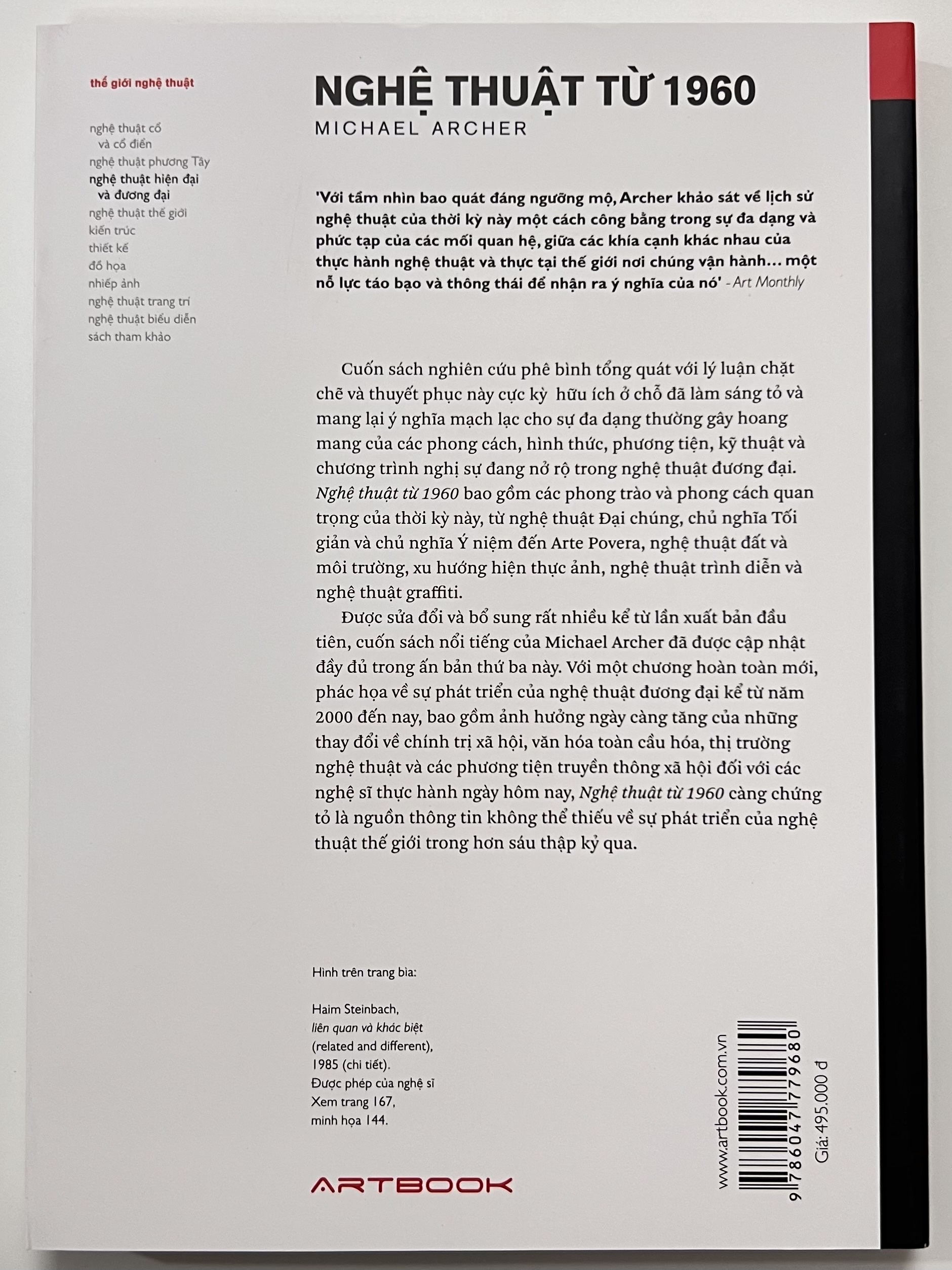 Được sửa đổi và bổ sung rất nhiều kể từ lần xuất bản đầu tiên, cuốn sách nổi tiếng của Michael Archer đã được cập nhật đầy đủ trong ấn bản thứ ba này. Với một chương hoàn toàn mới, phác họa về sự phát triển của nghệ thuật đương đại kể từ năm 2000 đến nay, bao gồm ảnh hưởng ngày càng tăng của những thay đổi về chính trị xã hội, văn hóa toàn cầu hóa, thị trường nghệ thuật và các phương tiện truyền thông xã hội đối với các nghệ sĩ thực hành ngày hôm nay, Nghệ thuật từ 1960 càng chứng tỏ là nguồn thông tin không thể thiếu về sự phát triển của nghệ thuật thế giới trong hơn sáu thập kỷ qua.