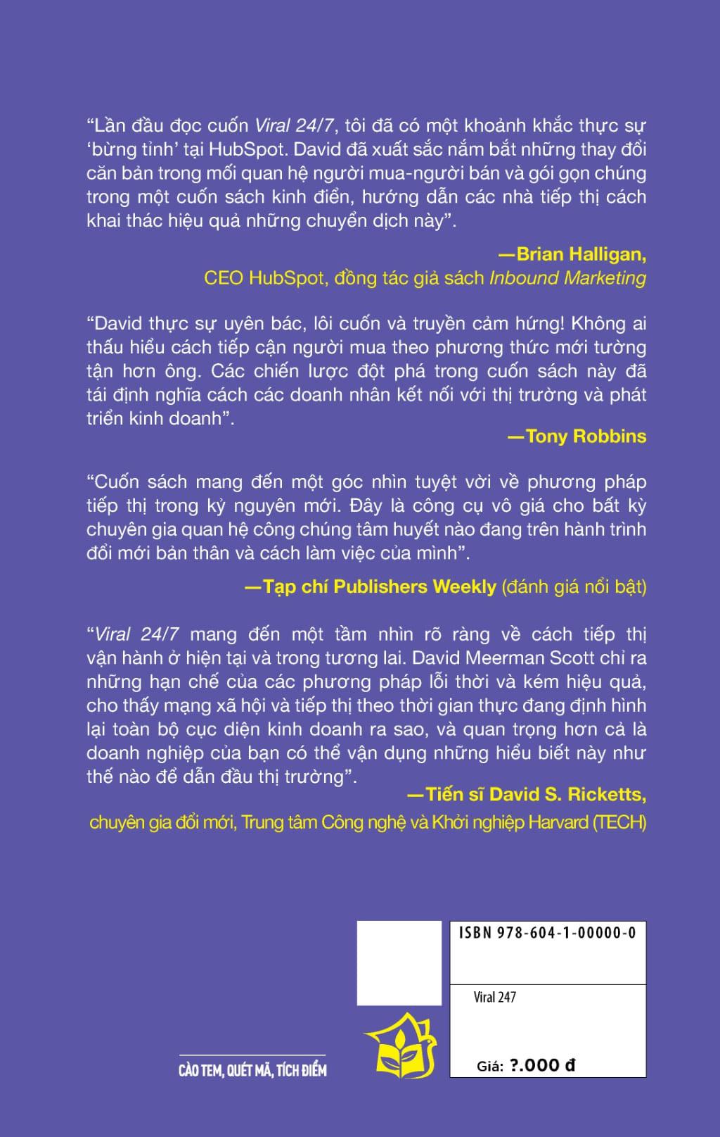 Trong bối cảnh giao tiếp không ngừng biến đổi, việc nắm bắt các xu hướng mới trong thế giới số đôi khi tưởng chừng như một thách thức lớn lao. Làm sao để sản phẩm hay dịch vụ của bạn không bị nhấn chìm giữa vô vàn thông tin trên mạng? "Viral 24/7" sẽ là chìa khóa giúp bạn khai thác hiệu quả sức mạnh của Internet để xây dựng thương hiệu, thu hút khách hàng và thúc đẩy kinh doanh.