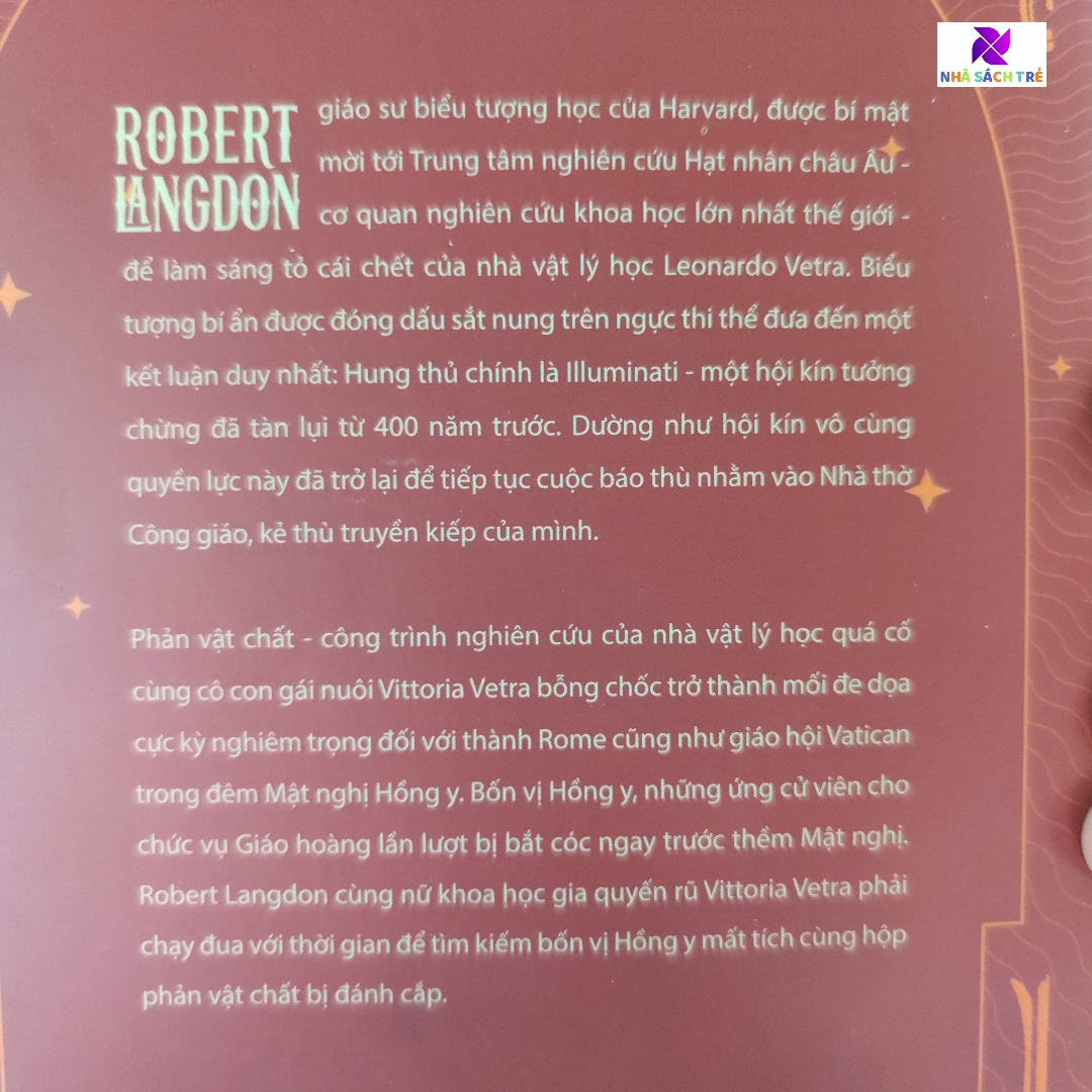 Thiên Thần và Ác Quỷ - Cuốn tiểu thuyết trinh thám khoa học giả tưởng đầy kịch tính của Dan Brown. “Thiên Thần và Ác Quỷ” thu hút người đọc bởi sự uyên bác và tài dẫn truyện của Dan Brown, người đã thể hiện khả năng nắm bắt siêu hạng về các lĩnh vực khoa học và tôn giáo qua loạt tác phẩm đã được phát hành ở Việt Nam như “Mật mã Da Vinci”, “Pháo đài số”… Cuộc chiến giữa tôn giáo và khoa học ẩn hiện trong “Thiên Thần và Ác Quỷ”. Bắt đầu bằng cái chết của một nhà khoa học tên tuổi, Robert Langdon, giáo sư trường Đại học Harvard, được mời đến hiện trường để xác nhận biểu tượng bí hiểm mà hung thủ đã khắc lên ngực nạn nhân. Kết luận: thủ phạm là Illuminati, một hội kín vốn đã ngừng hoạt động từ gần bốn trăm năm trước, giờ tái sinh để tiếp tục báo thù nhà thờ Thiên Chúa giáo, kẻ thù truyền kiếp của họ. Hồi hộp, háo hức, căng thẳng là cảm nhận của bạn đọc khi dõi theo hơn 600 trang viết của Dan Brown. Thiên Thần và Ác Quỷ là một cuộc phiêu lưu đầy kịch tính, và rất đời thườ hấp dẫn, tốc độ, và đầy chất trí tuệ. -------------------------
