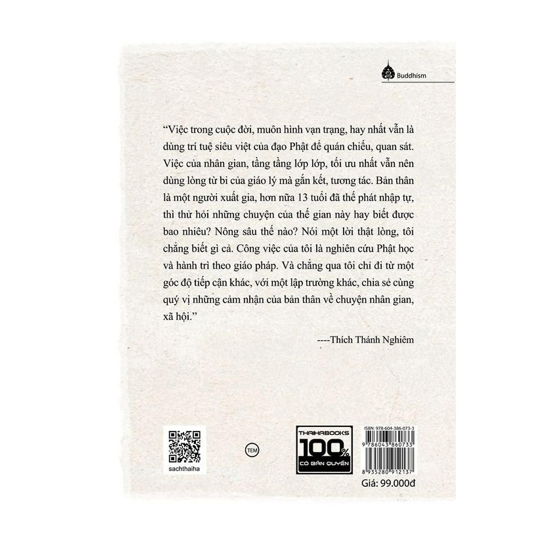Việc trong cuộc đời, muôn hình vạn trạng, hay nhất vẫn là dùng trí tuệ siêu việt của đạoPhật để quán chiếu, quan sát. Việc của nhân gian, tầng tầng lớp lớp, tối ưu nhất vẫn nêndùng lòng từ bi của giáo lý mà gắn kết, tương tác. Bản thân là một người xuất gia, hơn nữa13 tuổi đã thế phát nhập tự, thì thử hỏi những chuyện của thế gian này hay biết được baonhiêu? Nông sâu thế nào? Nói một lời thật lòng, tôi chẳng biết gì cả. Công việc của tôi lànghiên cứu Phật học và hành trì theo giáo pháp. Và chẳng qua tôi chỉ đi từ một góc độ tiếpcận khác, với một lập trường khác, chia sẻ cùng quý vị những cảm nhận của bản thân vềchuyện nhân gian, xã hội.