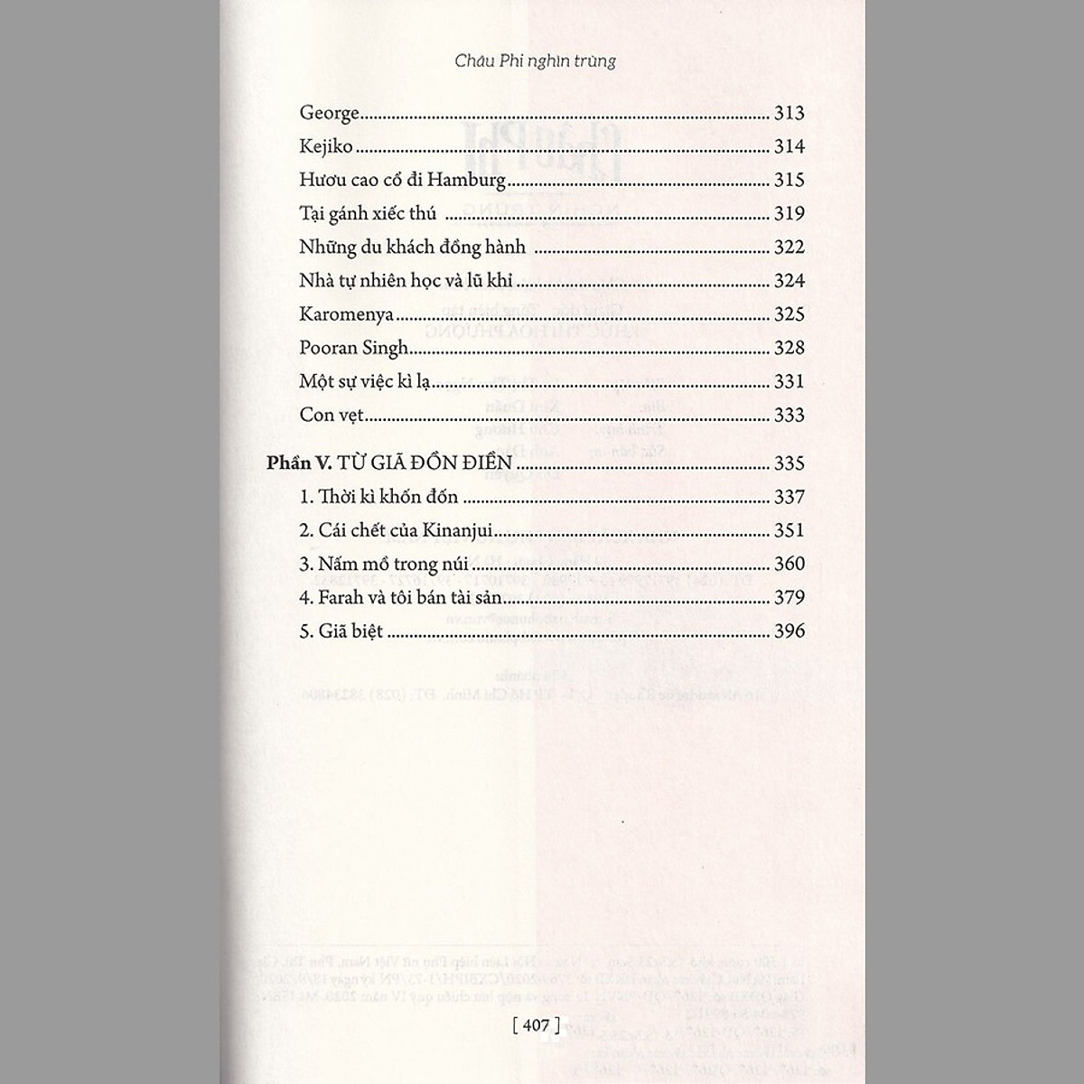 Châu Phi nghìn trùng bao gồm 5 phần: hai phần đầu tập trung mô tả cư dân bản xứ với những quan niệm lâu đời, độc đáo về công lí cũng như sự trừng phạt. Phần thứ ba, Các vị khách của đồn điền, chuyển sang khắc họa tuyến nhân vật tìm đến tá túc ở nhà Blixen – như bà lí giải: “Tại các xứ thuộc địa mới khai phá, lòng hiếu khách là điều cần thiết cho cuộc sống của không chỉ du khách mà cả của người định cư tại đây. Mỗi vị khách là một người bạn, đem đến tin tức, tốt hoặc xấu, thứ bánh mì cho những tâm trí đói khát sống nơi cô quạnh. Một người bạn chân chính ghé chơi là một thiên sứ, mang theo bánh thánh”. Phần bốn, Trích sổ tay một người nhập cư, bao gồm những ghi chép ngắn phản ánh đời sống của một thực dân da trắng tại châu Phi. Cuối cùng, phần năm khép lại dòng hồi ức: Đồn điền lụn bại, vài thân hữu của Blixen như thủ lĩnh Kinanjui, vận động viên Denys Finch-Hatton ra đi vĩnh viễn.