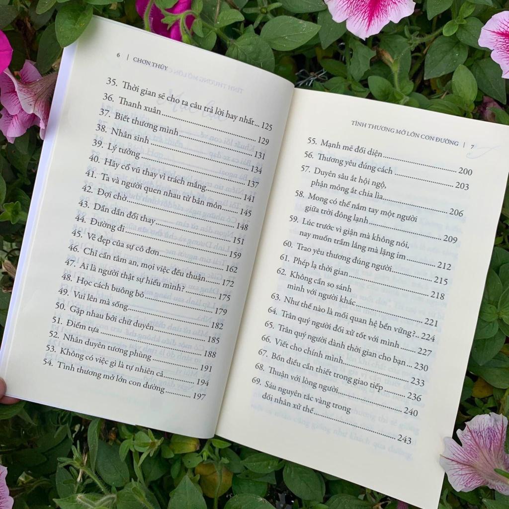 Cuốn sách Tình thương mở lớn con đường là một tập sách nhỏ với hơn sáu mươi bài viết, được người dịch Chơn Thủy góp nhặt hết sức kỳ công trong quá trình đi tìm nguồn tinh chất để nuôi dưỡng tâm hồn. Bao nhiêu câu chuyện là từng ấy những tâm tư tình cảm. Tất cả như sẵn sàng hun đúc cho những ai còn chới với giữa cuộc đời này. Bằng niềm tin và hy vọng, người dịch tin chắc rằng con đường của riêng mỗi người, khi lật qua từng trang sách này, sẽ tự hé mở để dẫn lối bước đi. Cuốn sách không chỉ mang lại cảm giác gần gũi, thân quen cho người đọc, mà còn khơi gợi nỗi niềm suy tư của chính mình về cuộc sống đang vận hành bên quanh ta.