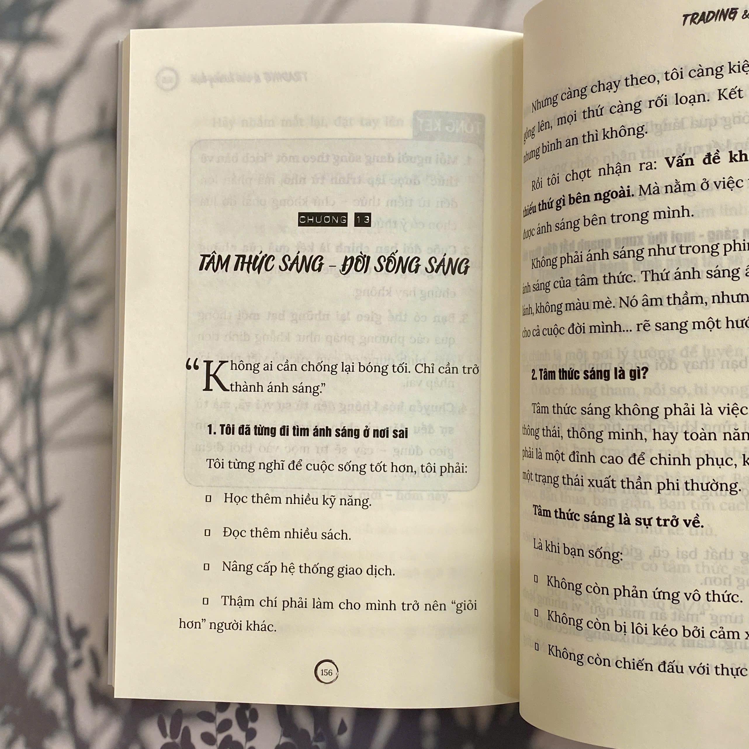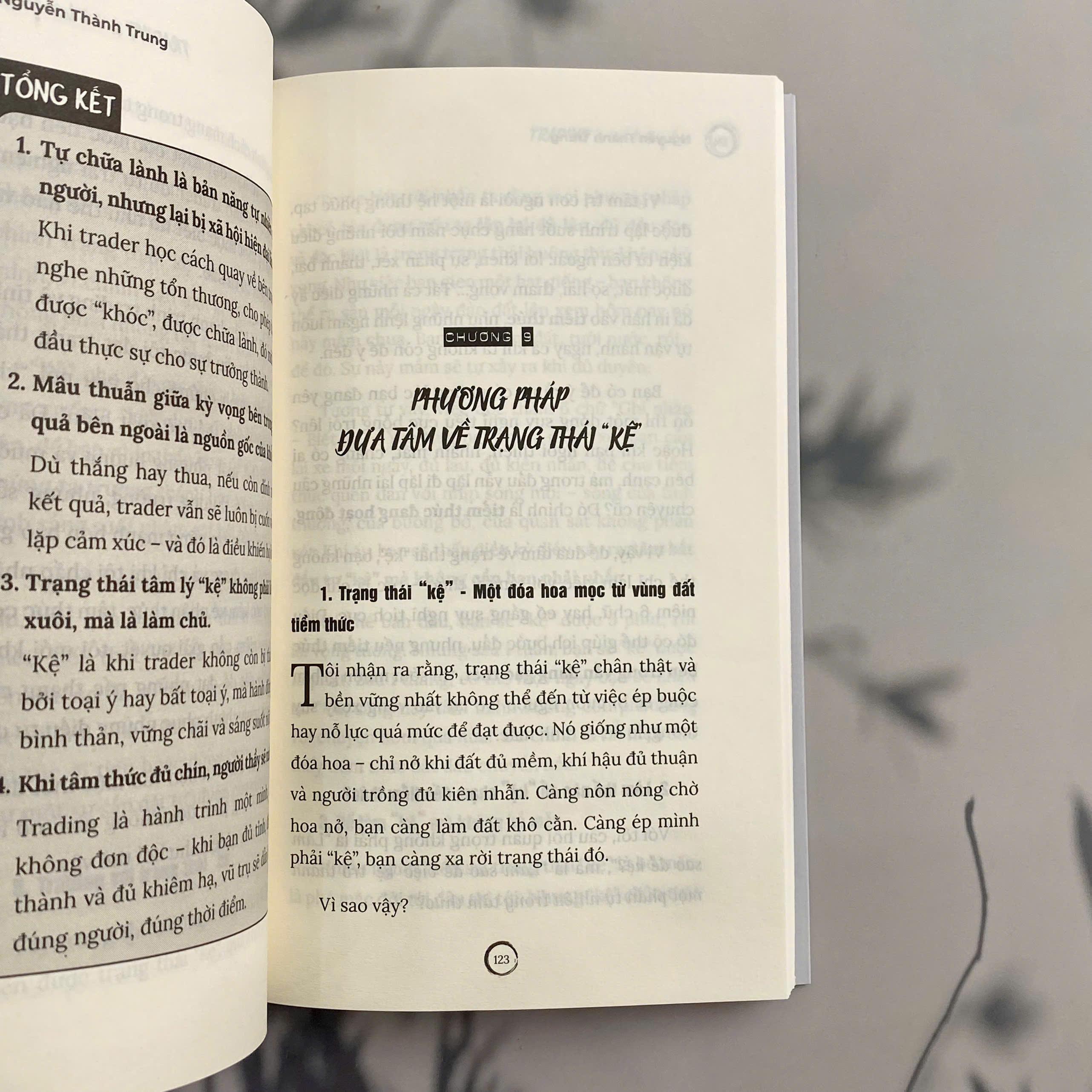 • Và cuối cùng là “Đạo”, con đường quay về với sự sáng rõ, bình an và tự do thật sự. Đây là cuốn sách dành cho: Những trader từng nhiều lần “cháy tài khoản” đến tuyệt vọng. Những ai mải miết chạy theo tự do vật chất mà quên mất sự tự do tâm hồn. Và những người đang tìm kiếm một con đường tỉnh thức giữa cuộc sống hiện đại đầy biến động. Cuốn sách đưa ra một góc nhìn rất “người”, rất chân thực về trading - không phải chỉ là phân tích kỹ thuật, mô hình nến hay quản lý vốn, mà là hành trình trưởng thành, học cách kỷ luật, chấp nhận sai lầm, vượt qua cảm xúc và cuối cùng là tìm thấy “đạo”, con đường về với sự bình an nội tại. “Bạn không thể kiểm soát thị trường, nhưng bạn có thể kiểm soát chính m.ình.” “Trading & Con đường Đạo” là cuốn sách giúp bạn hiểu rằng: hành trình kiếm tiền và hành trình trở thành một con người trọn vẹn, đôi khi chỉ là một.