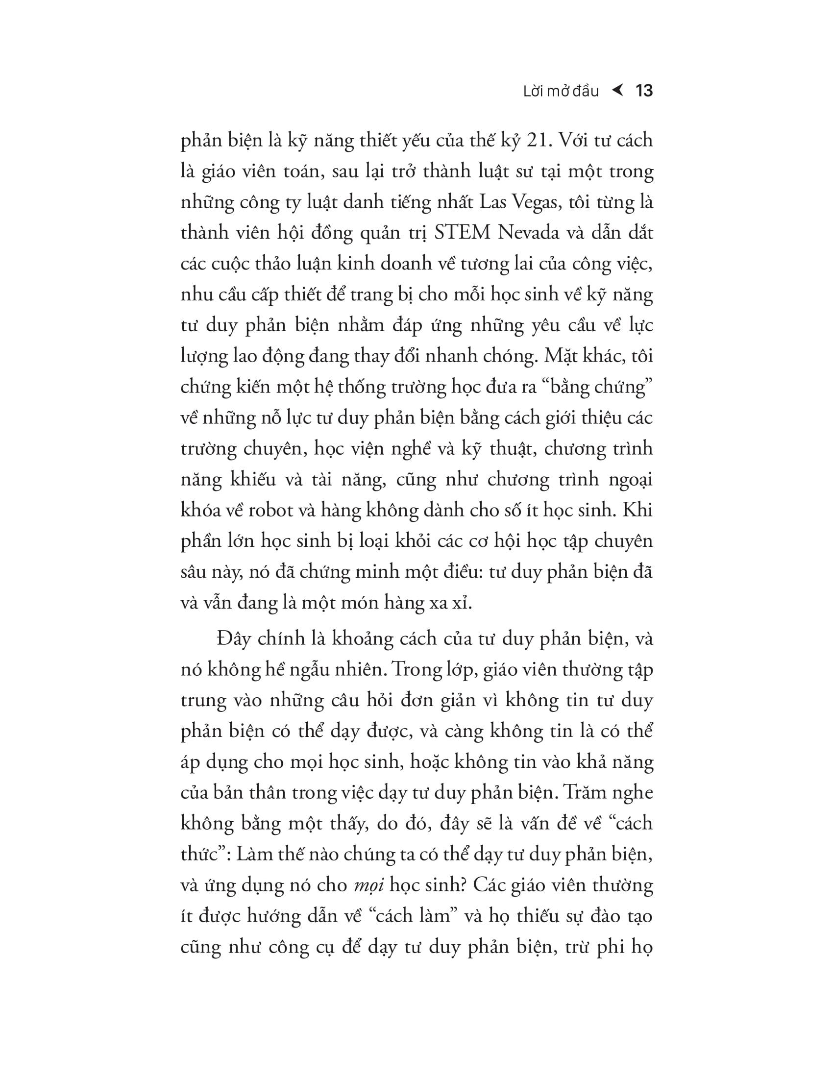Tập trung vào việc truyền cảm hứng nhưng cũng rất thực tế về cuộc cách mạng tư duy phản biện. Lấy câu chuyện từ chính bản thân tác giả, người đã vượt qua tình trạng không phát huy được hết tiềm năng, từ đó đưa ra định nghĩa và mở rộng khái niệm về tư duy phản biện thực sự là gì (tại sao nó lại khó đến vậy), đồng thời mở rộng những ví dụ thực tế để chứng minh vì sao khoảng cách trong tư duy phản biện là vấn đề công bằng quan trọng nhất trong giáo dục nhưng ít ai bàn đến.