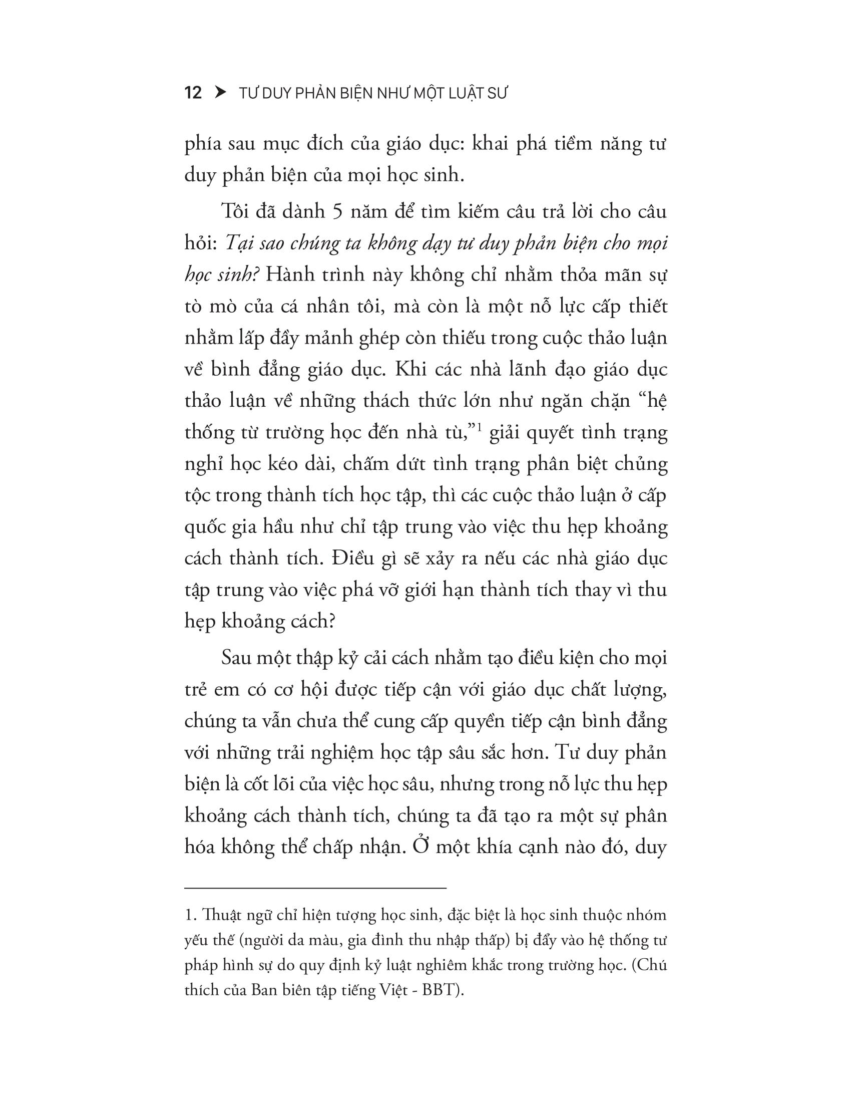 Tư duy phản biện như một luật sư là cẩm nang hướng dẫn phương thức giải phóng tiềm năng tư duy phản biện cho mọi học sinh. Bao gồm những thông tin thực tế để thiết kế ra những lớp học, nơi mà phụ huynh sẽ mong muốn con m.ình được tham gia. Cuốn sách không vẽ nên những câu chuyện viển vông, không tưởng, chỉ thực hiện được khi có công nghệ, không gian sáng tạo đắt tiền và có những học sinh với “thành tích cao”.