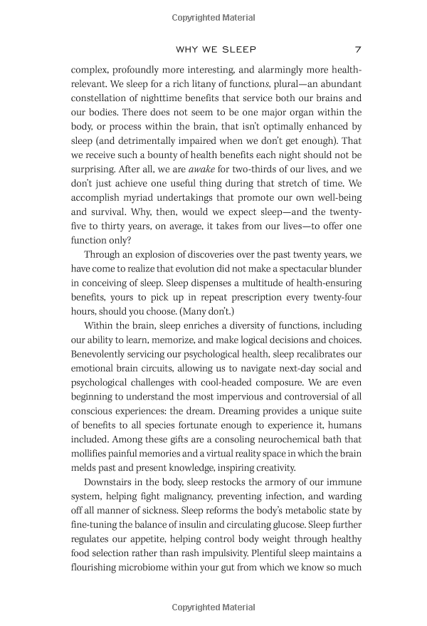 The first sleep book by a leading scientific expert--Professor Matthew Walker, Director of UC Berkeley's Sleep and Neuroimaging Lab--reveals his groundbreaking exploration of sleep, explaining how we can harness its transformative power to change our lives for the better. Sleep is one of the most important but least understood aspects of our life, wellness, and longevity. Until very recently, science had no answer to the question of why we sleep, or what good it served, or why we suffer such devastating health consequences when we don't sleep. Compared to the other basic drives in life--eating, drinking, and reproducing--the purpose of sleep remained elusive. An explosion of scientific discoveries in the last twenty years has shed new light on this fundamental aspect of our lives. Now, preeminent neuroscientist and sleep expert Matthew Walker gives us a new understanding of the vital importance of sleep and dreaming. Within the brain, sleep enriches our ability to learn, memorize, and make logical decisions. It recalibrates our emotions, restocks our immune system, fine-tunes our metabolism, and regulates our appetite. Dreaming mollifies painful memories and creates a virtual reality space in which the brain melds past and present knowledge to inspire creativity.