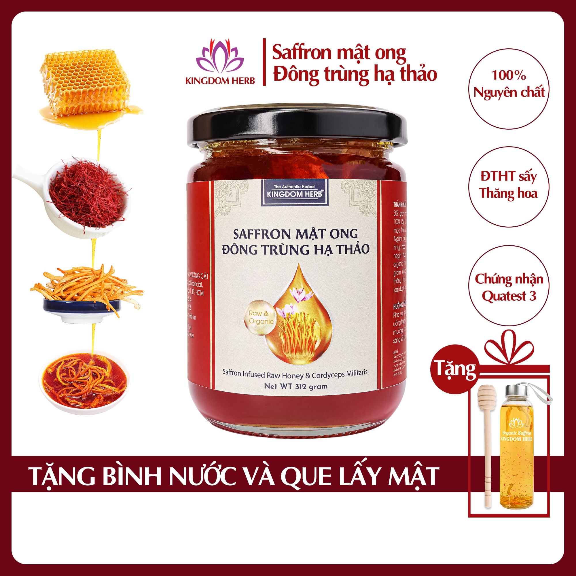 ✨Saffron mật ong đông trùng hạ thảo Kingdom Herb chính hãng thượng hạng hộp 312g (tặng bình thuỷ tinh và cây lấy mật)