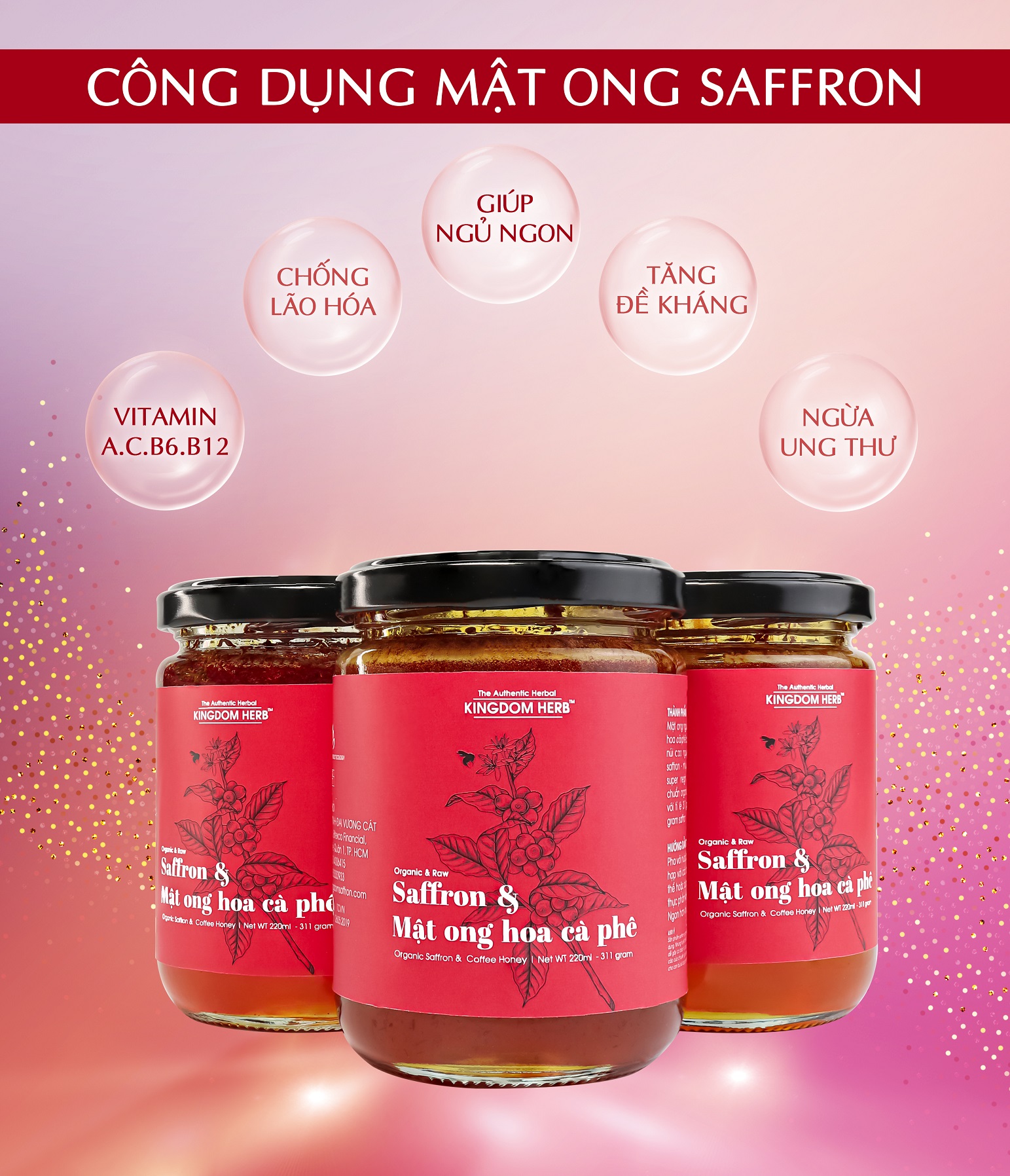 Saffron mật ong đông trùng hạ thảo Kingdom Herb hộp 312g (2g đông trùng + 1g saffron + 309g mật ong)