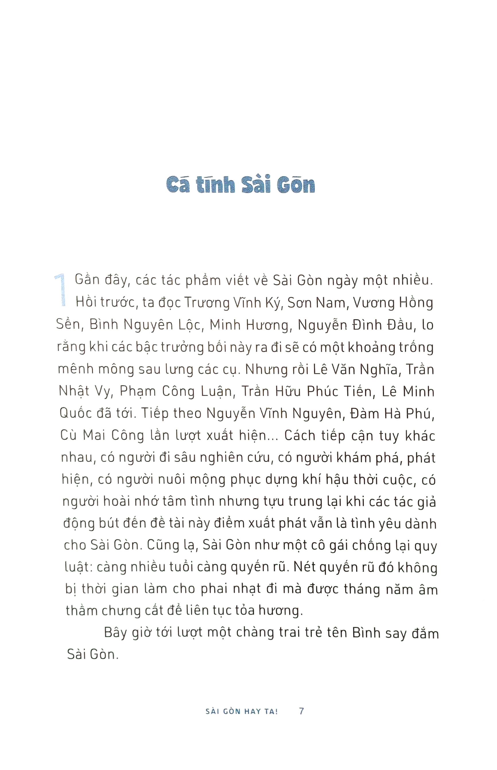 "Ở thành phố này, không ai buồn quá lâu đâu. Nghe thành phố thở đi, trong hơi thở đó có người Nghệ An, người Hà Nội, người Huế, người Hoa, người Khmer, người Hàn, người Mỹ Trong hơi thở đó có ta, có mình. Một thành phố tổng hợp mà không ô hợp, một thành phố xóa đi bản ngã, để dù có gốc gác ở nơi nào đi nữa cũng có thể nói tôi là người Sài Gòn.”