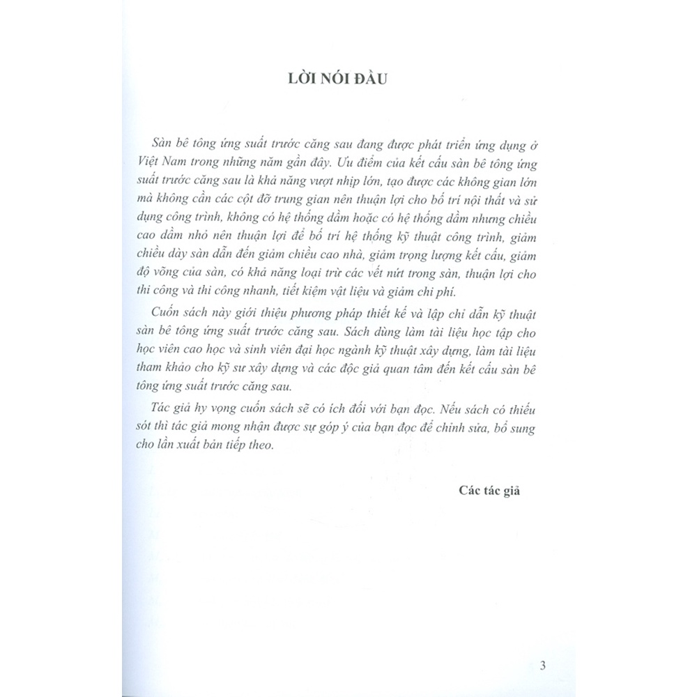sau là khả năng vượt nhịp lớn, tạo được các không gian lớn mà không cần các cột đỡ trung gian nên thuận lợi cho bố trí nội thất và sử dụng công trình, không có hệ thống dầm hoặc có hệ thống dầm nhưng chiều cao dầm nhỏ nên thuận lợi để bố trí hệ thống kỹ thuật công trình, giảm chiều dày sàn dẫn đến giảm chiều cao nhà, giảm trọng lượng kết cấu, giảm độ võng của sàn, có khả năng loại trừ các vết nứt trong sàn, thuận lợi cho thi công và thi công nhanh, tiết kiệm vật liệu và giảm chi phí. Cuốn sách này giới thiệu phương pháp thiết kế và lập chỉ dẫn kỹ thuật sàn bê tông ứng suất trước căng sau. Sách dùng làm tài liệu học tập cho học viên cao học và sinh viên đại học ngành kỹ thuật xây dựng, làm tài liệu tham khảo cho kỹ sư xây dựng và các độc giả quan tâm đến kết cấu sàn bê tông ứng suất trước căng sau.