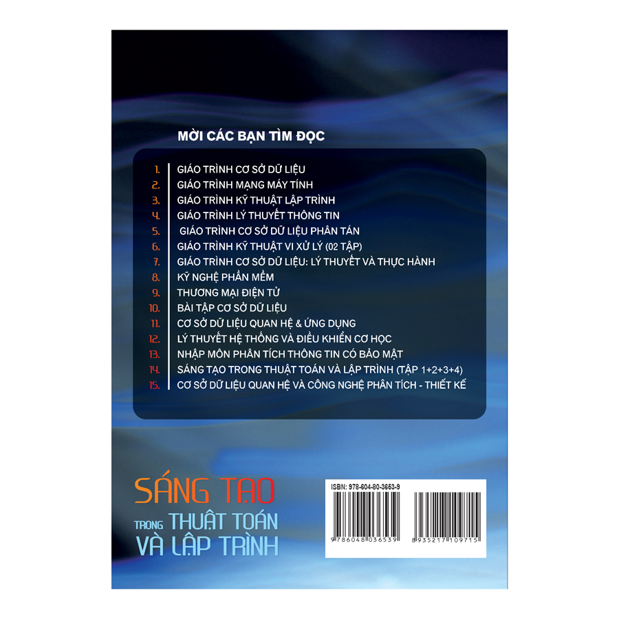 Cuốn sách “Sáng tạo trong thuật toán và lập trình” (tập 5) tiếp nối 4 tập trước đã xuất bản do PGS, TSKH. Nguyễn Xuân Huy biên soạn giới thiệu các kỹ thuật lập trình được minh họa qua những bài toán cụ thể tương đương với trình độ nâng cao của học sinh và sinh viên. Các kỹ thuật lập trình và phương pháp xây dựng thuật giải cho những bài toán thường được dùng rộng rãi trong quá trình thiết kế và cài đặt các phần mềm ứng dụng trong thực tiễn, vì vậy việc sớm làm chủ các tri thức này mới thật sự là cần thiết. Cuốn sách này cung cấp các chương trình viết bằng ngôn ngữ lập trình Free Pascal, Dev C++ và Java để bạn đọc tiện so sánh với lời giải của mình.