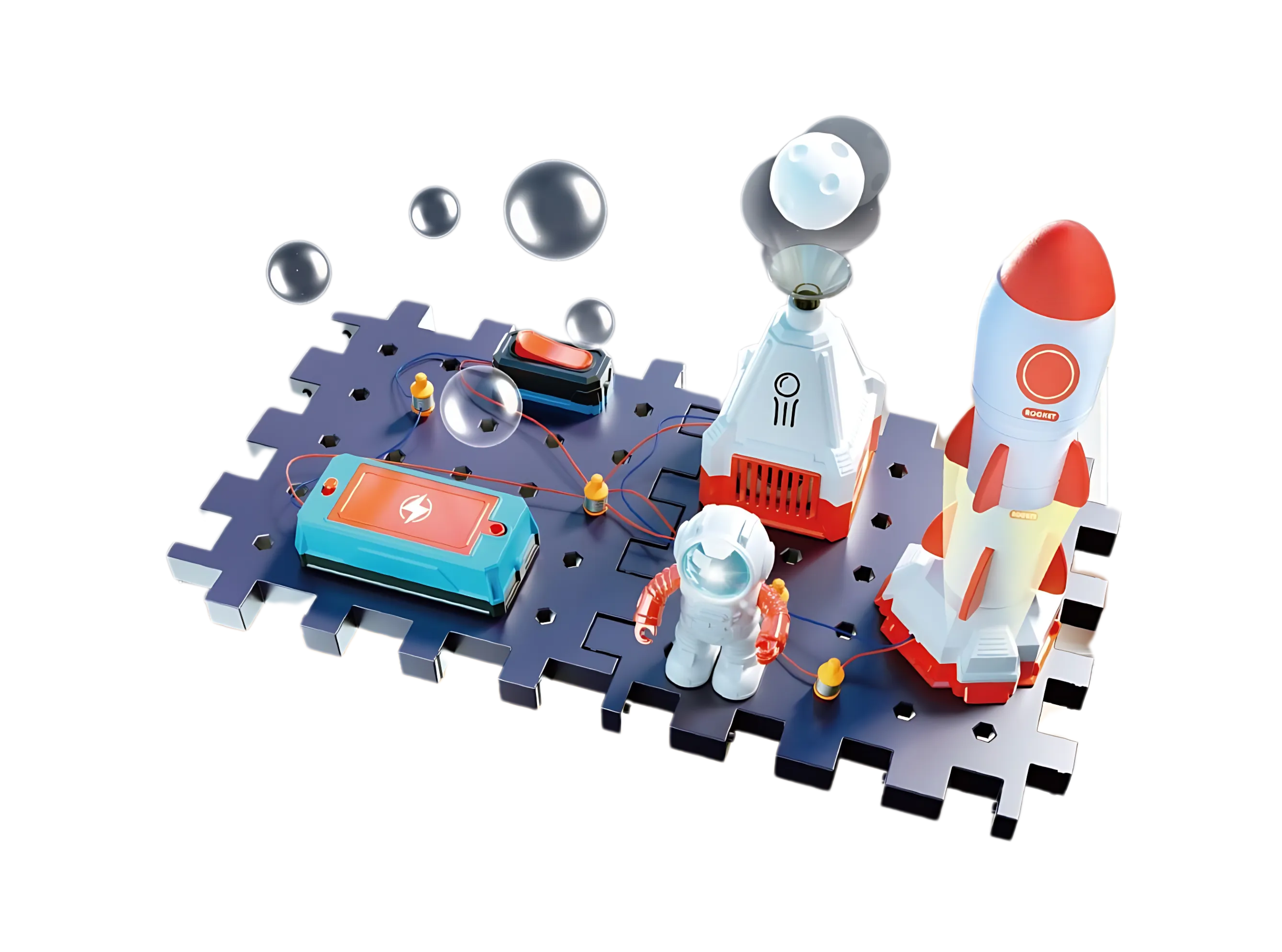 'Bộ đồ chơi lắp ráp điện tử chủ đề không gian dành cho bé từ 6 tuổi trở lên. Bé sẽ tự tay lắp ráp phi hành gia, tên lửa, bệ phóng và kết nối