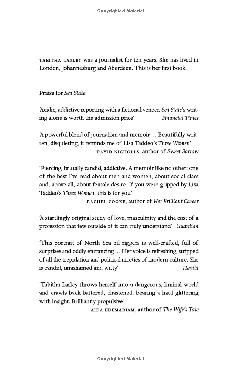 Tabitha Lasley left her job, her relationship and London, and headed to Aberdeen to meet offshore oil rig workers. She wanted to see what men are like with no women around. She soon finds out what she is like with no one else around, save for itinerant men who spend half their lives stranded in the middle of the sea. Alone, and contemplating the wreckage of her former life, she dives into a relationship with the first rig worker she meets, a reckless affair that lays them both bare.