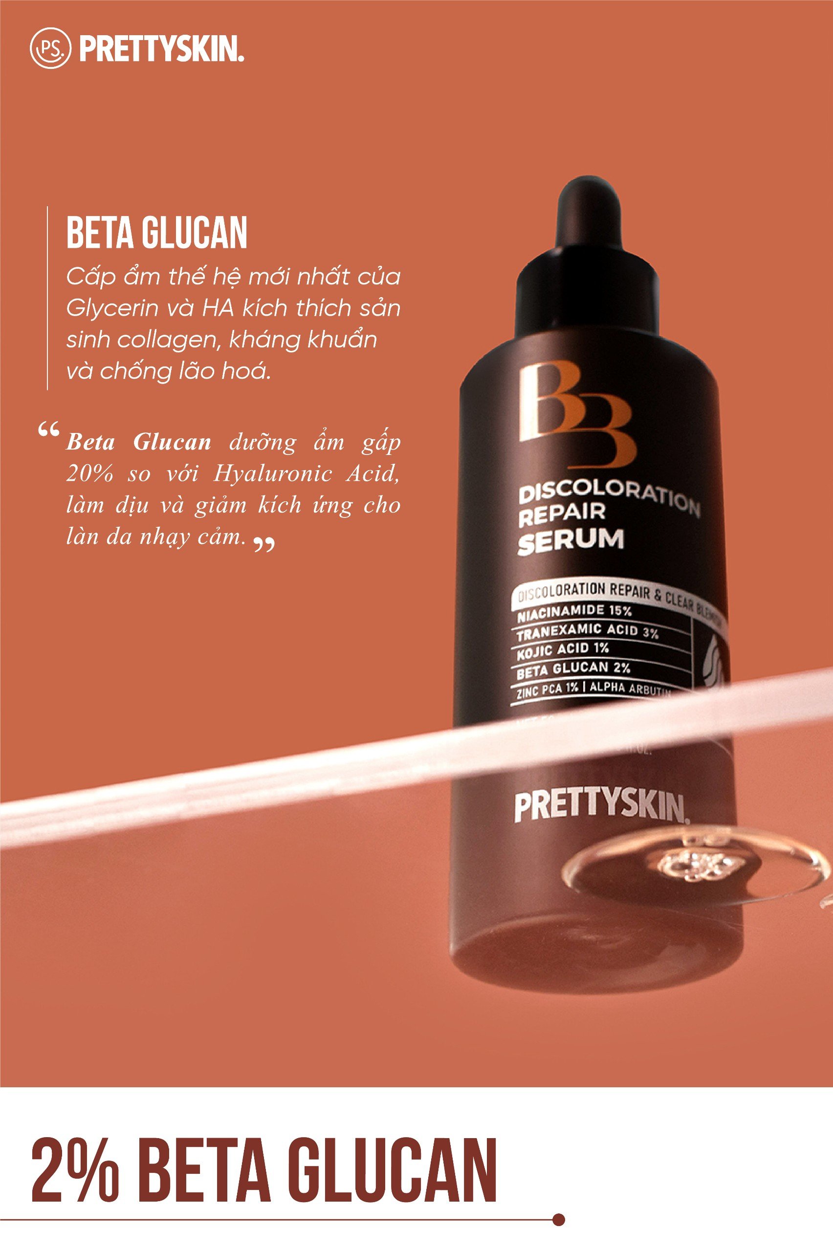 Mua tại TiktokChiêm ngưỡng bảng thành phần đẹp như mơ của Serum B3 Prettyskin Serum B3 Prettyskin sửa chữa sắc tố, xoá mờ thâm nám, tàn nhang, đồi mồi, hiệu quả gấp 3, ngăn ngừa lão hoá, cấp ẩm làm mềm da, kiểm soát dầu thừa,… nhờ bảng thành phần ấn tượng, có 1-0-2 trên thị trường Niacinamide 15% (nồng độ hiếm gặp) giúp làm se khít lỗ chân lông, chống oxy hoá, làm mờ thâm sẹo, cải thiện các đốm nâu, làm đều màu da Tranexamic Acid 3% ức chế Melanin, ngăn chặn sắc tố xuất hiện trên bề mặt da, làm mờ vết thâm nám, đồi mồi do tiếp xúc với mặt trời Kojic Acid 1% ngăn chặn hình thành Tyrosine và quá trình sản xuất melanin giúp da trắng sáng hơn Beta Glucan 2% cấp ẩm cho da, kích thích sản sinh collagen, kháng khuẩn và chống lão hoá da Sự kết hợp giữa Tranexamic Acid và Kojic Acid giúp đẩy nhanh tốc độ làm sáng da và giúp giải quyết triệt để, tận gốc các vết nám, tàn nhang,…