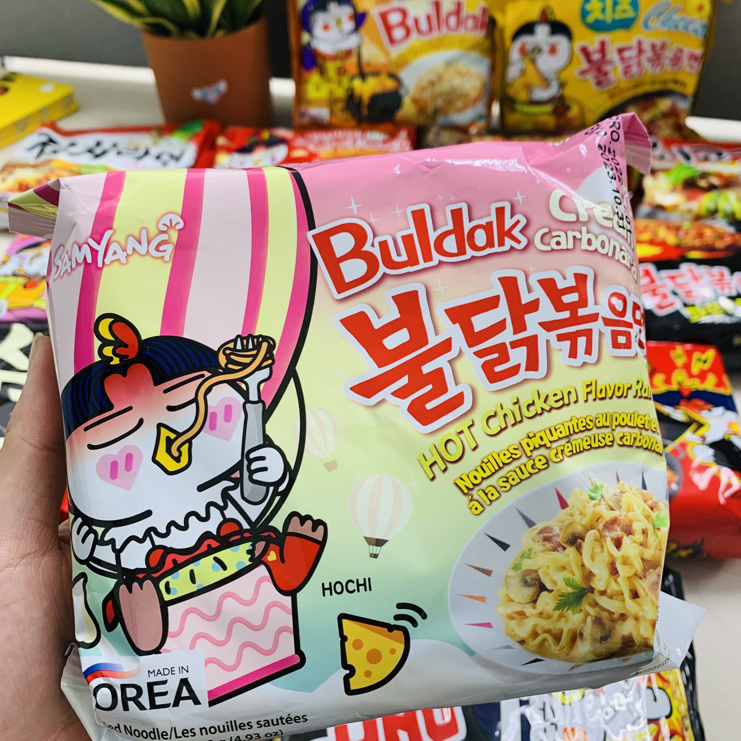 Mì khô gà cay Samyang vị kem Carbonara là thành viên mới của gia đình nhà mì gà cay Samyang. Với bên ngoài bao bì cực kì dễ thương là màu hồng nhạt không thể