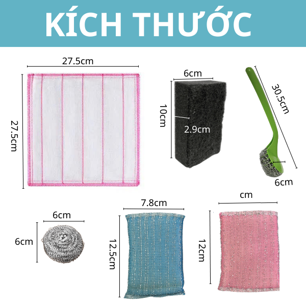 - 1 set gồm: 3 búi cước inox + 1 tay cầm búi cước + 2 lưới rửa chén + 1 mút rửa chén + 1 khăn lâu