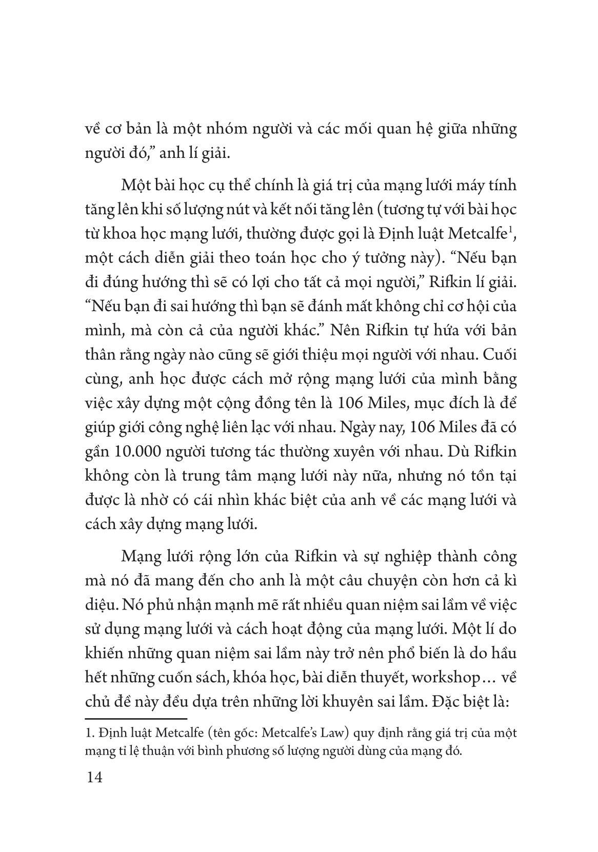 Đây không chỉ là cuốn sách dạy cách kết giao. Cuốn sách này không giống bất cứ cuốn sách dạy kết giao nào mà bạn từng đọc (hoặc đã bỏ qua) trước đó. Đây là một cuốn sách nói về cách mạng lưới vận hành trong thực tế. Sẽ không có những lời khuyên sáo rỗng và những hướng dẫn cụ thể về cách gặp gỡ bạn mới hoặc cách bắt chuyện làm quen. Sẽ không có cách quản lí hay làm đẹp trang mạng xã hội của bạn. Đã có rất nhiều cuốn sách như vậy rồi nên thêm một cuốn nữa cũng chẳng ích gì – hơn thế, chỉ mở rộng số lượng người quen thôi thì không đủ.