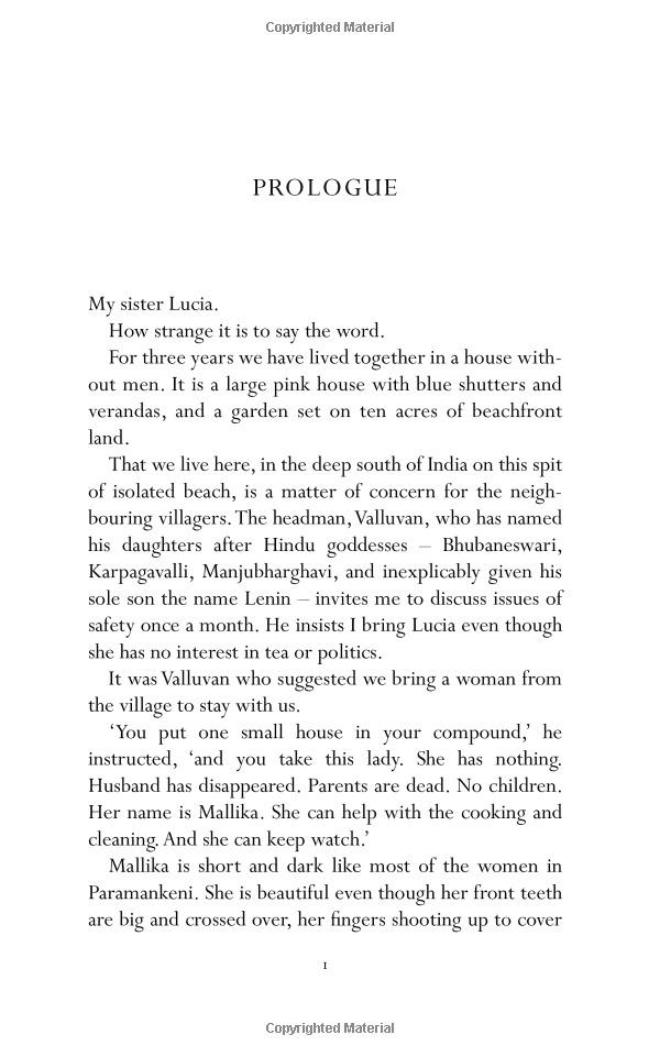 Escaping her failing marriage, Grace has returned to Pondicherry to cremate her mother. Once there, she finds herself heir to an unexpected inheritance. First, there is the strange pink house, blue-shuttered, out on a spit of the wild beach, haunted by the rattle of fishermen in their catamarans. And then there is the sister she never knew she had: Lucia, who has spent her life in a residential facility.