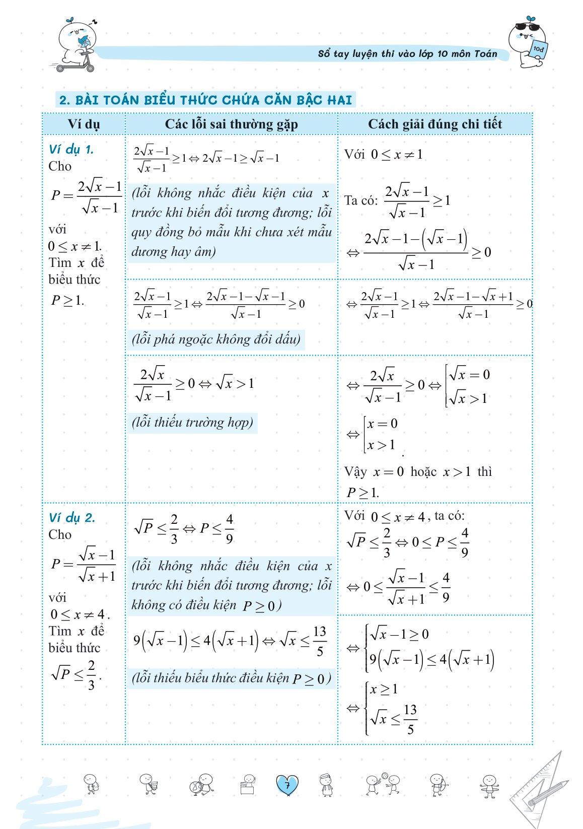 Sổ tay dành riêng một chương để thống kê các lỗi sai thường gặp khi giải toán. Đây là các lỗi sai của học sinh được tổng hợp từ các thầy cô nhiều năm kinh nghiệm trong việc giảng dạy, chấm thi kỳ thi vào 10. Điều này giúp bạn nhận ra những sai lầm thường mắc phải và tránh lặp lại chúng. Chương này cũng cung cấp cách giải đúng cho từng lỗi, giúp bạn hiểu rõ và sửa chữa những sai sót của m.ình.