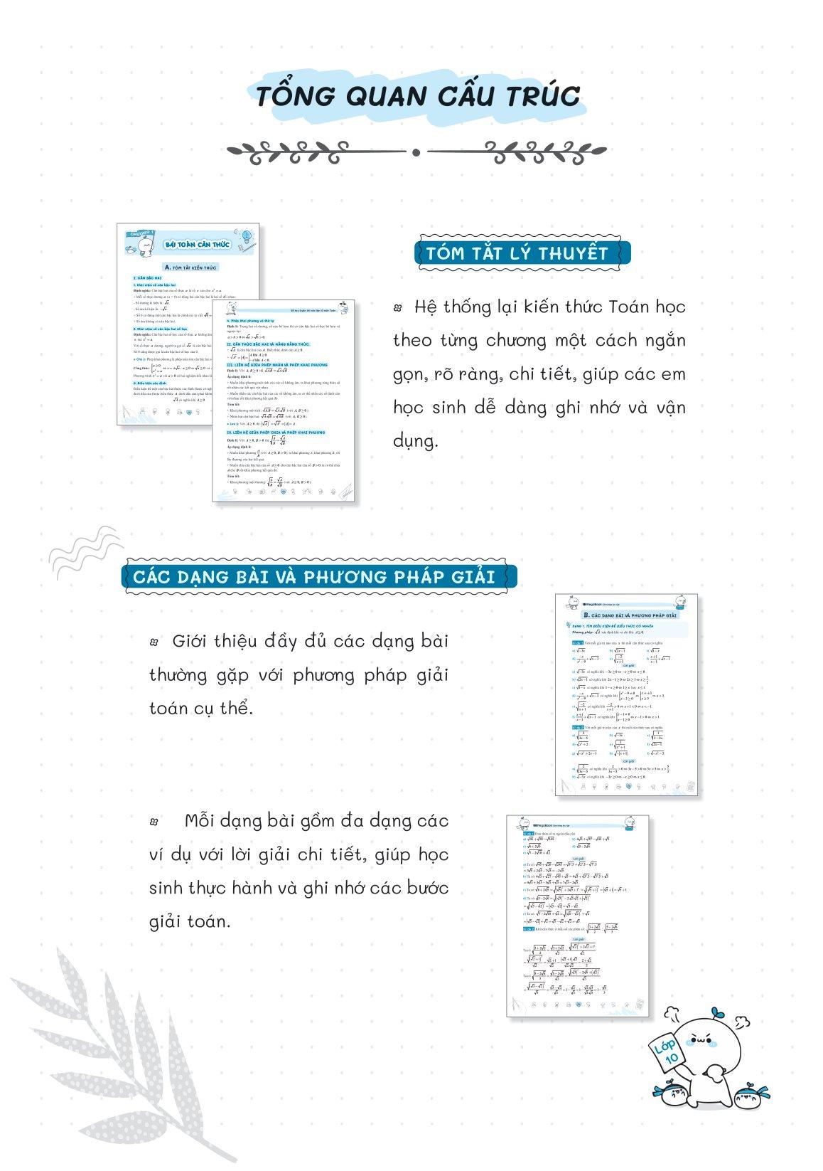 Cuốn sách bao gồm 12 chương kiến thức ngắn gọn nhất, trọng tâm nhất, chắc chắn xuất hiện 99% đề thi vào 10. Sổ tay đã được biên soạn và hệ thống hóa kiến thức toán học một cách tỉ mỉ và logic. Các chương sách được xây dựng một cách ngắn gọn, rõ ràng và chi tiết, giúp bạn nắm bắt và hiểu rõ từng khái niệm và các kiến thức cần nhớ.