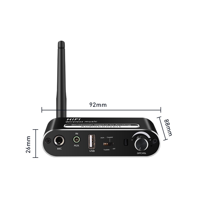 Tính năng: Bộ thu âm thanh tương thích với Bluetooth, bộ chuyển đổi âm thanh kỹ thuật số sang tương tự, bộ điều hợp phát lại đĩa flash USB. Có dây thành không dây, biến