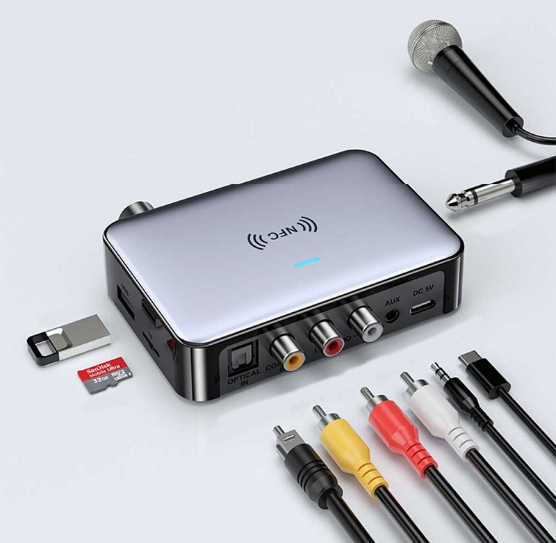 Tính năng: Bộ thu âm thanh tương thích với Bluetooth, bộ chuyển đổi âm thanh kỹ thuật số sang tương tự, bộ điều hợp phát lại đĩa flash USB. Có dây thành không dây, biến