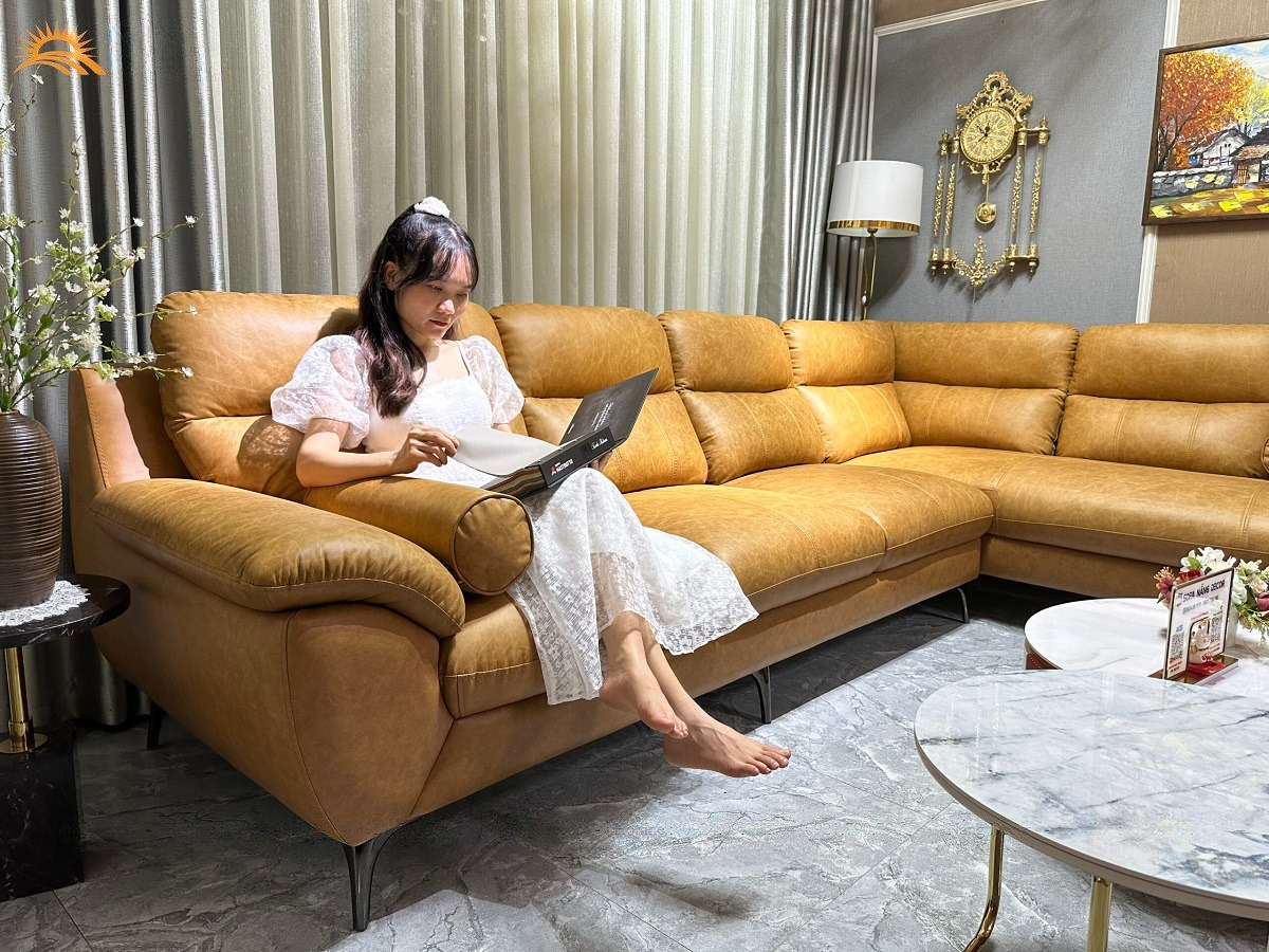 ✨Sofa góc L da bò Italy Juno sofa màu vàng bò – SFLCT01 3m3 x 2m8 hàng cao cấp chuẩn da bò nhập khẩu Ý