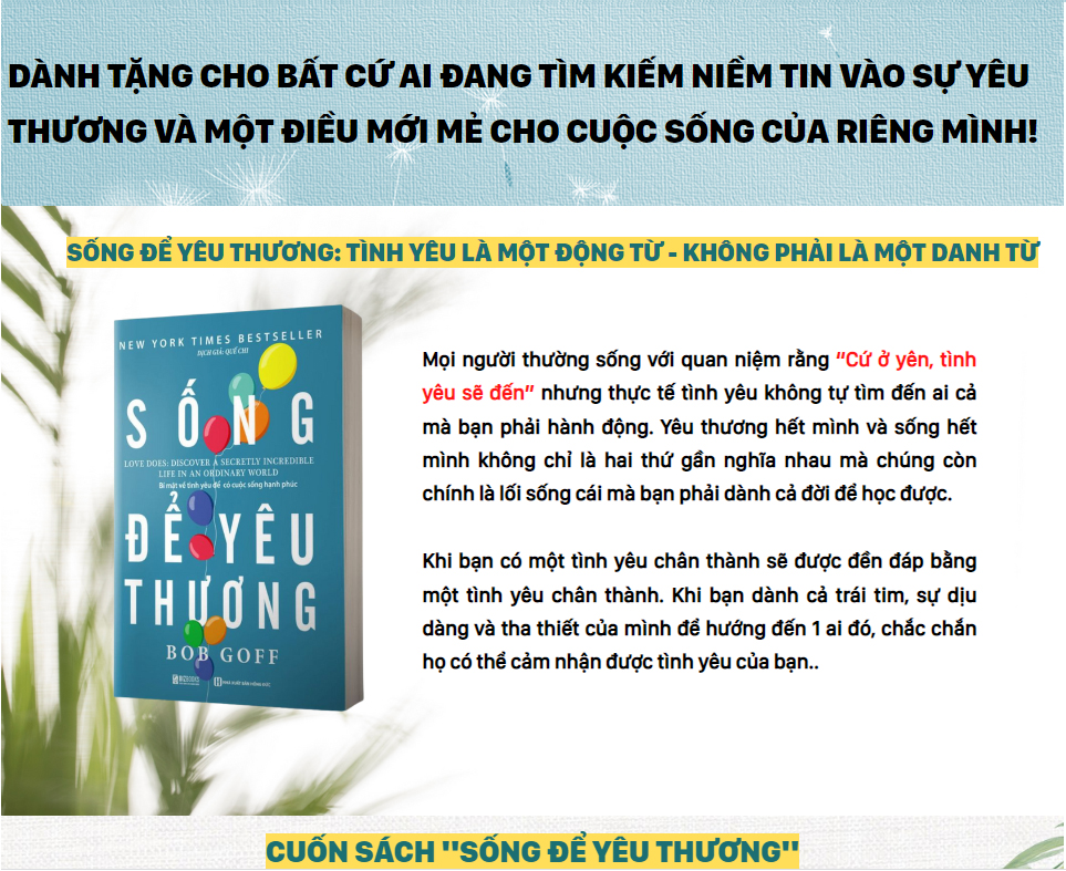 Đôi khi những người như Bob goff lại xuất hiện để nhắc nhở chúng ta rằng có một vài thứ quan trọng hơn rất nhiều so với những thứ khác. Sống để yêu thương giống như kim chỉ nam, thôi thúc bạn phải tập trung cuộc sống, năng lượng vào những điều ý nghĩa nhất. “ Sống để yêu thương ” không chỉ là một cuốn sách về sự hạnh phúc của tình yêu, dạy bạn học cách yêu thương và cách khiến bạn được yêu thương. Mà trong đó còn chứa đựng những bài học quý báu mà chính tác giả đã rút ra trong chính cuộc đời mình về sự thất bại, sự kiên trì, những sai lầm trong cuộc sống, sự hoàn hảo, sự tử tế, hy vọng và lý tưởng trong cuộc sống mỗi người, rất nhiều giá trị hơn cả một quyển sách.