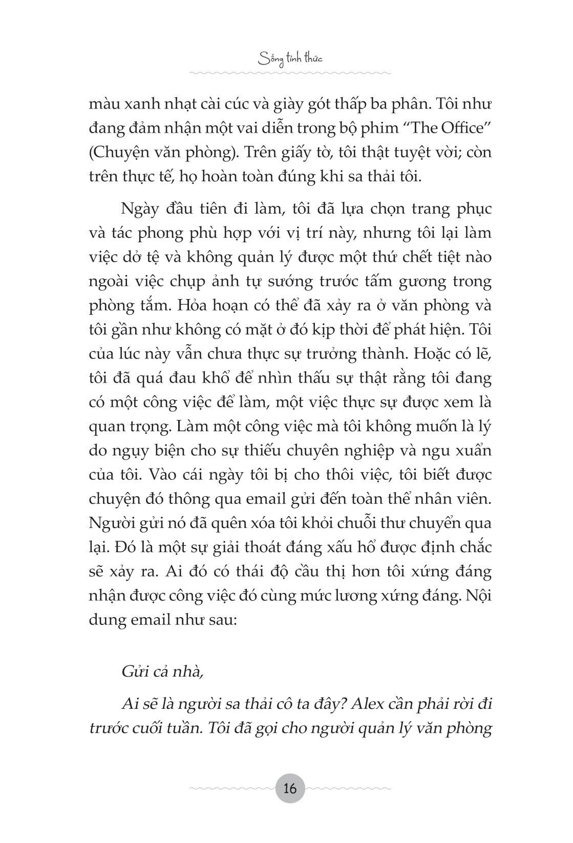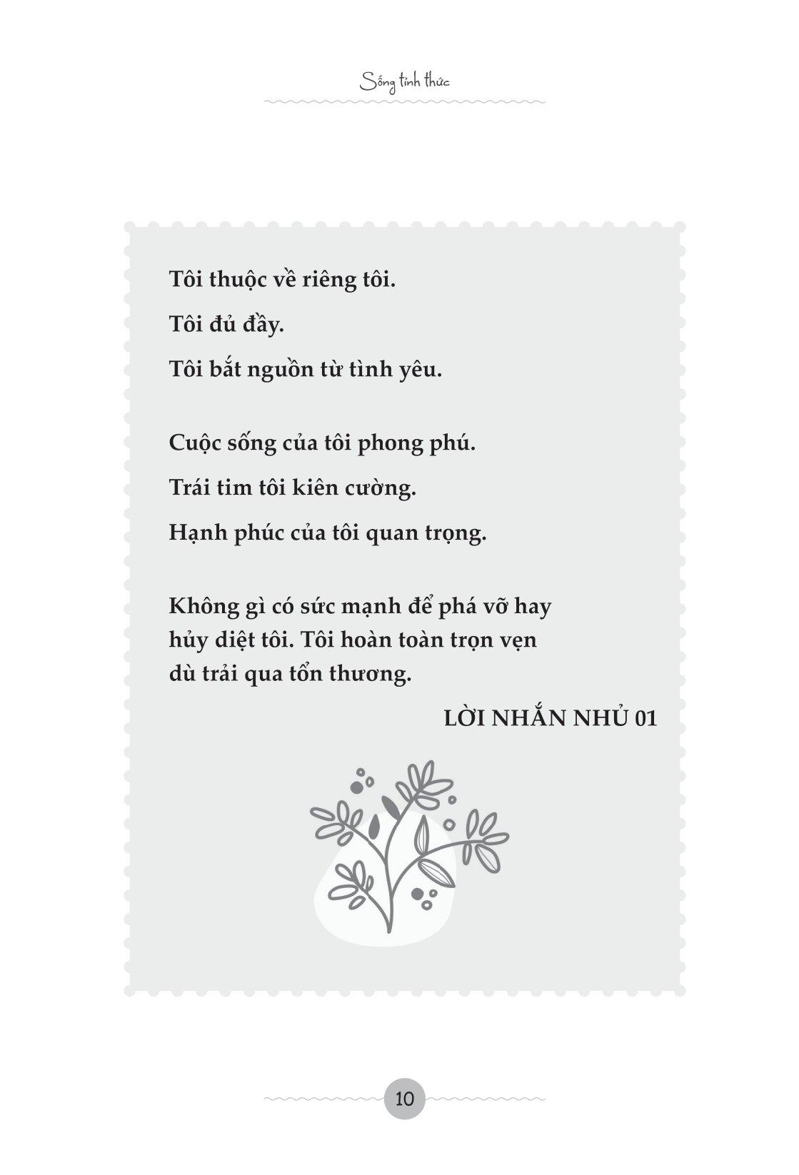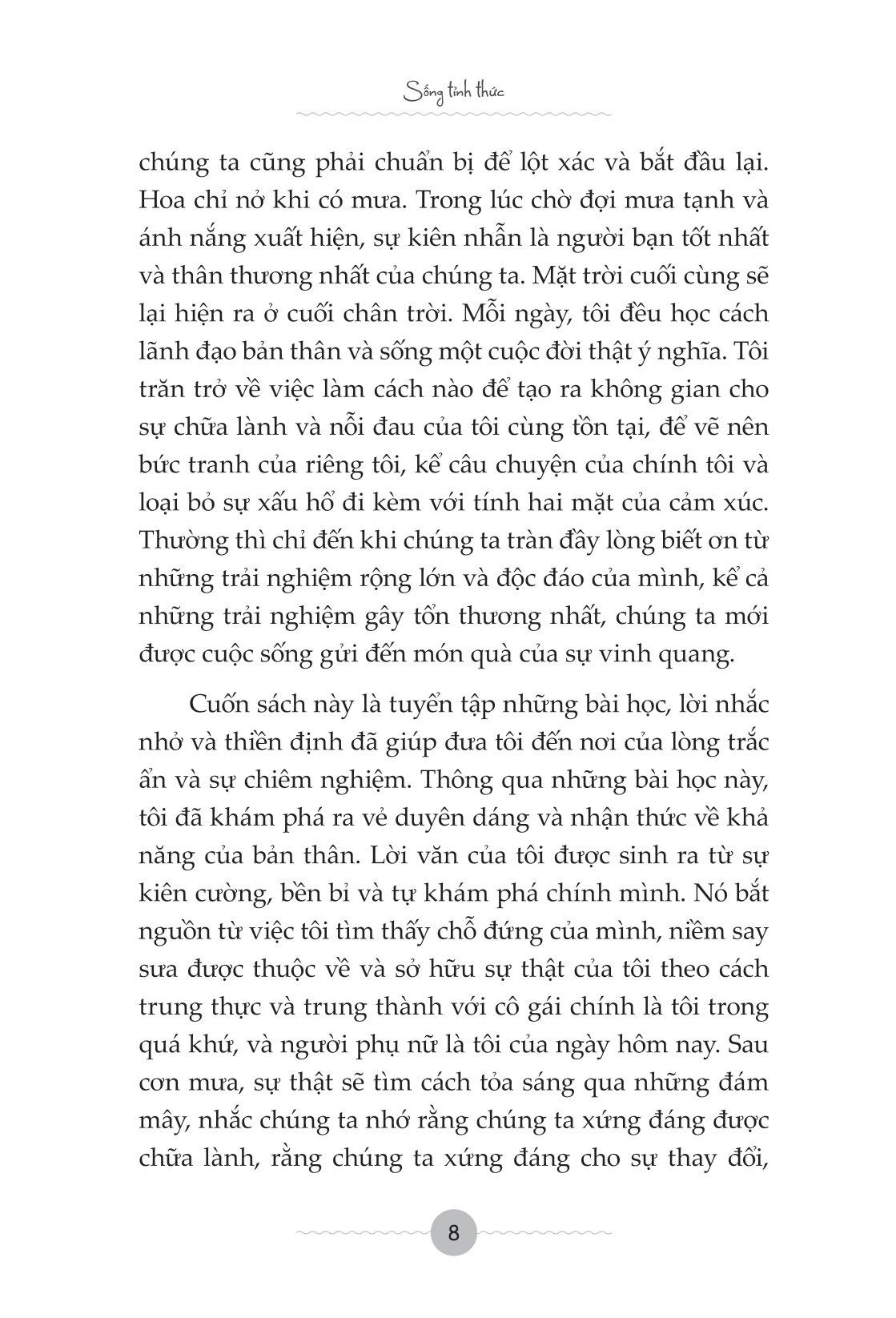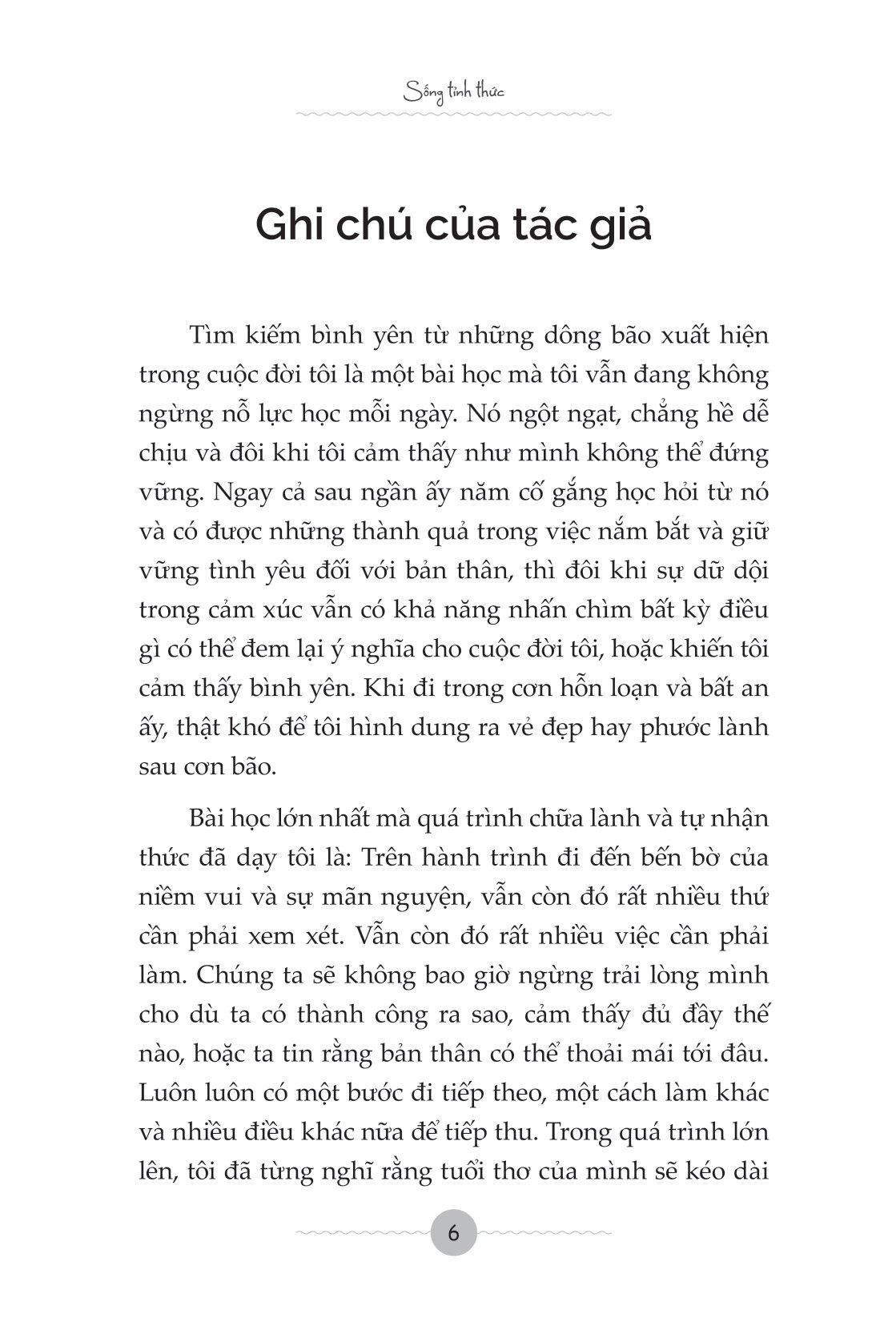 Cuốn sách Sống tỉnh thức: Hành trình chữa lành đứa trẻ bên trong bạn là tuyển tập những bài học, lời nhắc nhở và những bài thiền định mà tác giả gửi đến bạn để chạm đến nơi của lòng trắc ẩn và sự chiêm nghiệm. Thông qua những bài học này, bạn có thể khám phá và bộc lộ một bản thân tràn đầy năng lượng, nhận thức về khả năng của chính mình. Lời văn trong từng trang sách sẽ giúp bạn thấy được sự kiên cường, bền bỉ của tác giả và sau cùng là khéo léo truyền động lực để bạn có thể thực hành sống tỉnh thức hiểu rõ hơn về bản thân m.ình.