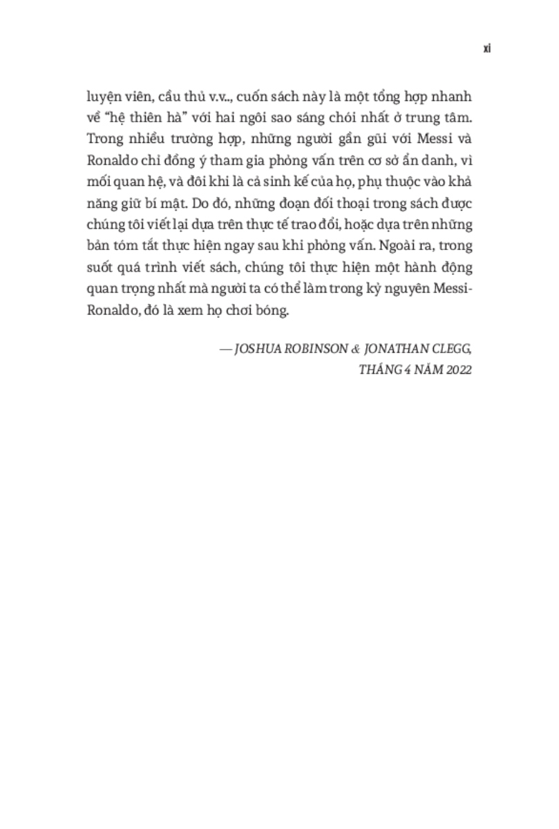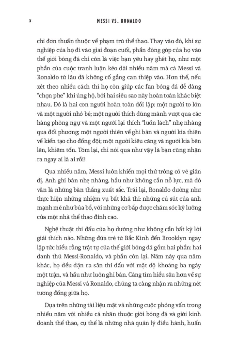World Cup 2022 có lẽ là giải vô địch thế giới cuối cùng với cả Messi và Ronaldo. Do đó, cuốn sách này cũng dành nhiều trang đánh giá về di sản của họ cho bóng đá, cũng như phân tích những ảnh hưởng mà tài năng của họ tạo ra, cả tích cực lẫn tiêu cực. Hơn cả việc đơn thuần liệt kê những thành tích của hai siêu sao, đây thực sự là một “tiểu sử của cuộc đua tranh” vốn đã trở thành một lăng kính quan trọng để hiểu về quá khứ, hiện tại và tương lai của bóng đá thế giới .