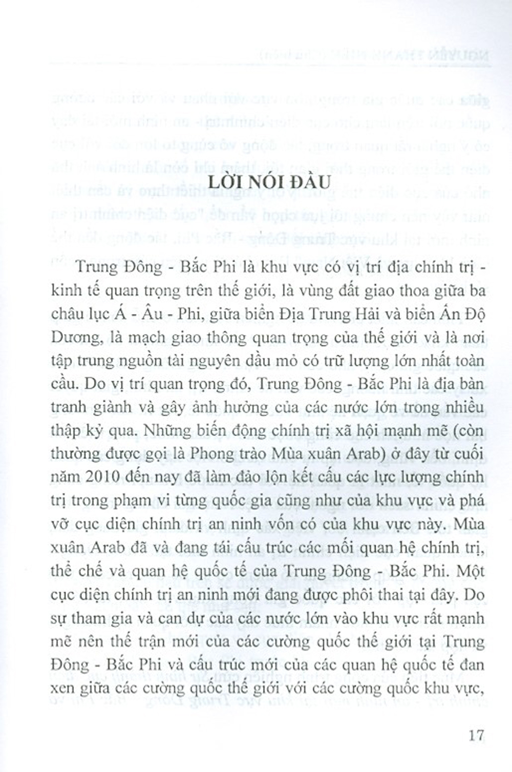 Trung Đông - Bắc Phi là khu vực có vị trí địa chính trị - kinh tế quan trọng trên thế giới, là vùng đất giao thoa giữa ba châu lục A – Âu – Phi, giữa biển Địa Trung Hải và biển Ấn Độ Dương, là mạch giao thông quan trọng của thế giới và là nơi tập trung nguồn tài nguyên dầu mỏ có trữ lượng lớn nhất toàn cầu. Do vị trí quan trọng đó, Trung Đông – Bắc Phi là địa bàn tranh giành và gây ảnh hưởng của các nước lớn trong nhiều thập kỷ qua. Những biến động chính trị xã hội mạnh mẽ (còn thường được gọi là Phong trào mùa xuân Arab) ở đây từ cuối năm 2010 đến nay đã làm đảo lộn kết cấu các lực lượng chính trị trong phạm vi từng quốc gia cũng như của khu vực và phá vỡ cục diện chính trị an ninh mới đang được phôi thai tại đây.