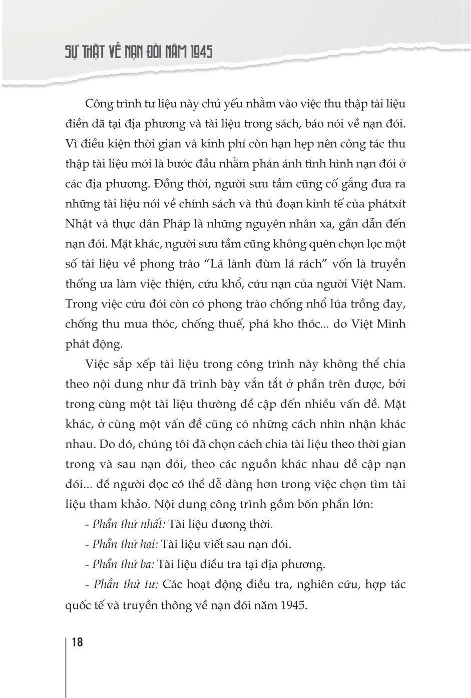 Cuốn sách được thai nghén và thực hiện trong nhiều năm, kết tinh từ nỗ lực khảo cứu, sưu tầm tư liệu, điều tra thực địa và tổng hợp ký ức của hàng trăm nhân chứng sống. Không chỉ dừng lại ở việc thuật lại sự kiện, tác phẩm tái hiện một cách chi tiết, chân thực và đầy ám ảnh thảm họa nạn đói thông qua các nguồn tư liệu đa dạng: từ văn bản chính thức của chính quyền Nhật - Pháp và chính phủ bù nhìn Trần Trọng Kim, đến các bài báo, truyền đơn của Việt Minh, các ghi chép đương thời, cùng những hồi ký, công trình nghiên cứu sau năm 1945. Nổi bật hơn cả là việc tác giả và cộng sự đã thực hiện một cuộc điều tra xã hội học quy mô tại 19 điểm thuộc 8 tỉnh, nơi chịu ảnh hưởng nặng nề nhất của nạn đói, cung cấp những con số và câu chuyện khiến người đọc không thể dửng dưng.