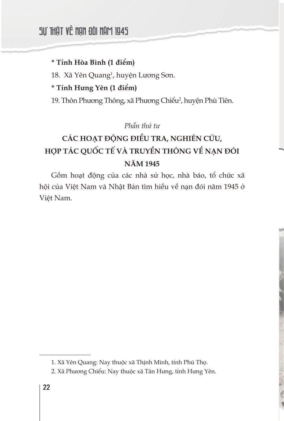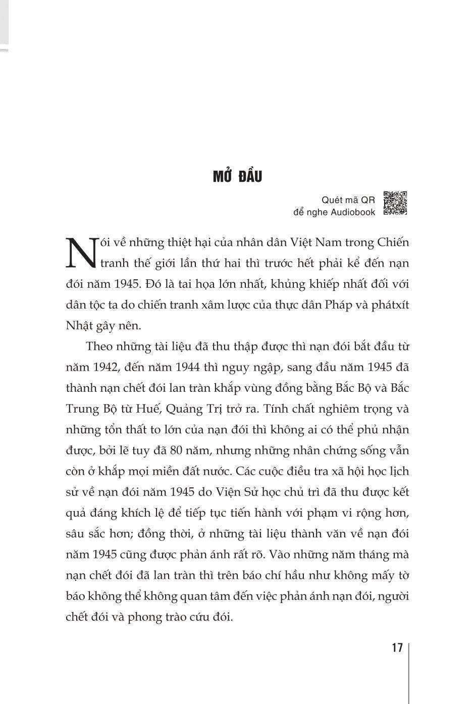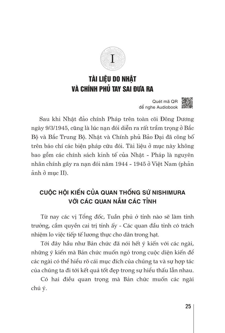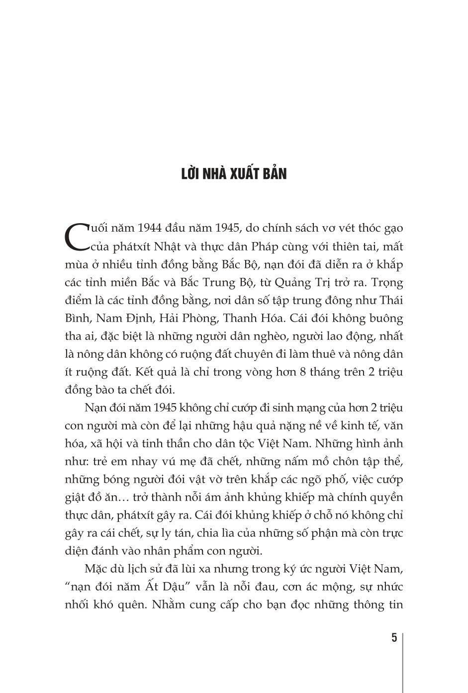 Qua từng trang sách, hiện lên một nước Việt nghèo đói, tan hoang, tang tóc. Những vùng đồng bằng Bắc Bộ là vựa lúa của cả nước lại trở thành nơi xác người nằm la liệt trên đường làng, bến nước. Người dân phải ăn rễ cây, vỏ chuối, rêu đá, thậm chí cả xác người để duy trì sự sống. Những bức ảnh của Võ An Ninh, những ghi chép của các nhà báo thời kỳ đó, những con số điều tra định lượng... tất cả tạo thành một bức tranh đau lòng nhưng cần thiết để hiểu trọn vẹn về hoàn cảnh đã châm ngòi cho cuộc cách mạng vĩ đại.