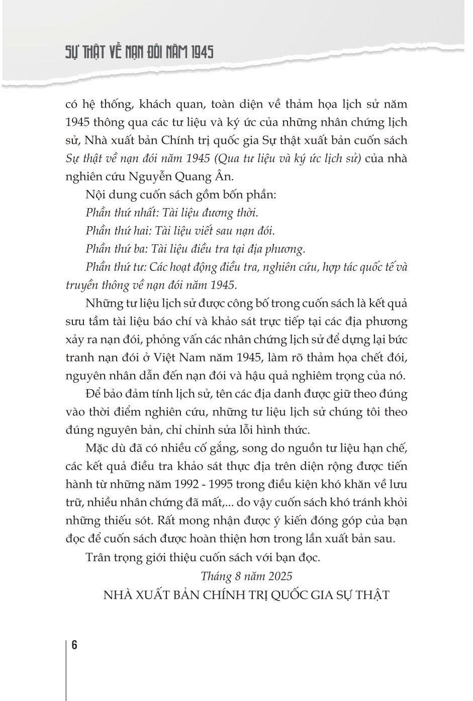 Nhân dịp kỷ niệm 80 năm Cách mạng Tháng Tám và Quốc khánh 2/9, việc đọc, suy ngẫm và lan tỏa cuốn sách "Sự thật về nạn đói năm 1945" không chỉ là một hoạt động tri ân quá khứ, mà còn là cách để mỗi người dân Việt Nam làm sâu sắc hơn lòng yêu nước, hun đúc tinh thần đoàn kết và vững tin vào con đường phát triển mà cha ông đã đánh đổi bằng máu, nước mắt và cả sự sống để giành lấy.