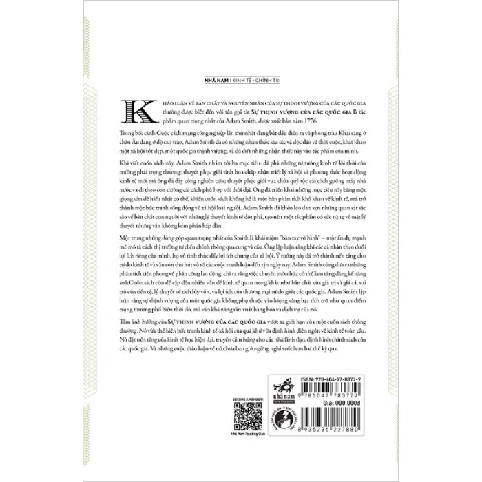 Sự Thịnh Vượng Của Các Quốc Gia - The Wealth Of Nations (Bìa Cứng) Bản dịch của: Tạ Ngọc Thạch và Phạm Thị Ngọc Trâm Hiệu Đính: TS Vũ Hoàng Linh Với lời giới thiệu của Đinh Tuấn Minh và Nghiêm Thị Thà Khảo luận về bản chất và nguyên nhân của sự thịnh vượng của các quốc gia thường được biết đến với tên gọi tắt Sự thịnh vượng của các quốc gia là tác phẩm quan trọng nhất của Adam Smith, được xuất bản năm 1776. Trong bối cảnh Cuộc cách mạng công nghiệp lần thứ nhất đang bắt đầu diễn ra và phong trào Khai sáng ở châu Âu đang ở độ cao trào, Adam Smith đã có những nhận thức sâu sắc và độc đáo về thời cuộc, khát khao một xã hội tốt đẹp, một quốc gia thịnh vượng, và đã đưa những nhận thức này vào tác phẩm của mình. Khi viết cuốn sách này, Adam Smith nhắm tới ba mục tiêu: đả phá những tư tưởng kinh tế lỗi thời của trường phái trọng thương; thuyết phục giới tinh hoa chấp nhận triết lý xã hội và phương thức hoạt động kinh tế mới mà ông đã dày công nghiên cứu; thuyết phục giới vua chúa quý tộc cải cách guồng máy nhà nước và đi theo con đường cải cách phù hợp với thời đại. Ông đã triển khai những mục tiêu này bằng một giọng văn dễ hiểu nhất có thể, khiến cuốn sách không hề là một bản phân tích khô khan về kinh tế, mà trở thành một bức tranh sống động về xã hội loài người. Adam Smith đã khéo léo đan xen những quan sát sắc sảo về bản chất con người với những lý thuyết kinh tế đột phá, tạo nên một tác phẩm có sức nặng về mặt lý thuyết nhưng vẫn không kém phần hấp dẫn. Một trong những đóng góp quan trọng nhất của Smith là khái niệm "bàn tay vô hình" - một ẩn dụ mạnh mẽ mô tả cách thị trường tự điều chỉnh thông qua cung và cầu. Ông lập luận rằng khi các cá nhân theo đuổi lợi ích riêng của mình, họ vô tình thúc đẩy lợi ích chung của xã hội. Ý tưởng này đã trở thành nền tảng cho tự do kinh tế và vẫn còn thu hút vô số các cuộc tranh luận đến tận ngày nay. Adam Smith cũng đưa ra những phân tích tiên phong về phân công lao động, chỉ ra rằng việc chuyên môn hóa có thể làm tăng đáng kể năng suấtCuốn sách còn đề cập đến nhiều vấn đề kinh tế quan trọng khác như bản chất của giá trị và giá cả, vai trò của tiền tệ, lý thuyết về tích lũy vốn, và lợi ích của thương mại tự do giữa các quốc gia. Adam Smith lập luận rằng sự thịnh vượng của một quốc gia không phụ thuộc vào lượng vàng bạc tích trữ như quan điểm trọng thương phổ biến thời đó, mà vào khả năng sản xuất hàng hóa và dịch vụ của nó. Tầm ảnh hưởng của Sự thịnh vượng của các quốc gia vượt xa giới hạn của một cuốn sách thông thường. Nó vừa thể hiện bức tranh kinh tế-xã hội của quá khứ vừa định hình diễn ngôn về kinh tế toàn cầu. Nó đặt nền tảng của kinh tế học hiện đại, truyền cảm hứng cho các nhà lãnh đạo, định hình chính sách của các quốc gia. Và những cuộc thảo luận về nó chưa bao giờ ngừng nghỉ suốt hơn hai thế kỷ qua.